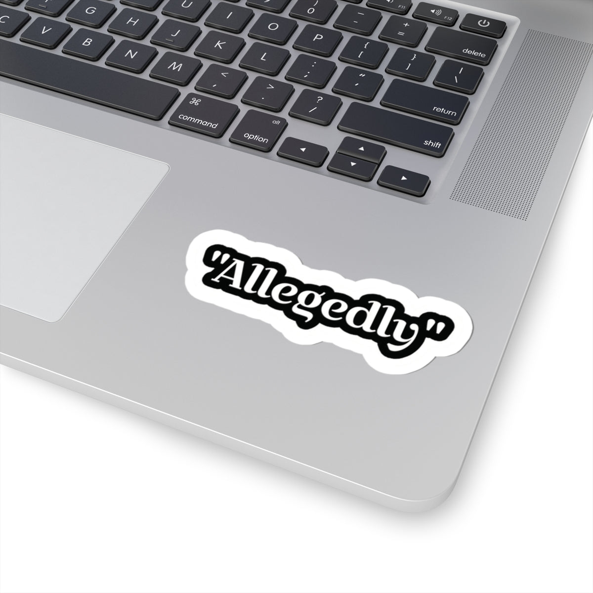 Add a wink of humor to your everyday essentials with this cheeky, retro-style Allegedly sticker. Featuring bold script typography and a thick white kiss-cut border, this black-and-white design pops with a glossy vinyl finish that instantly elevates laptops, journals, phone cases, water-bottle wraps, and more.
