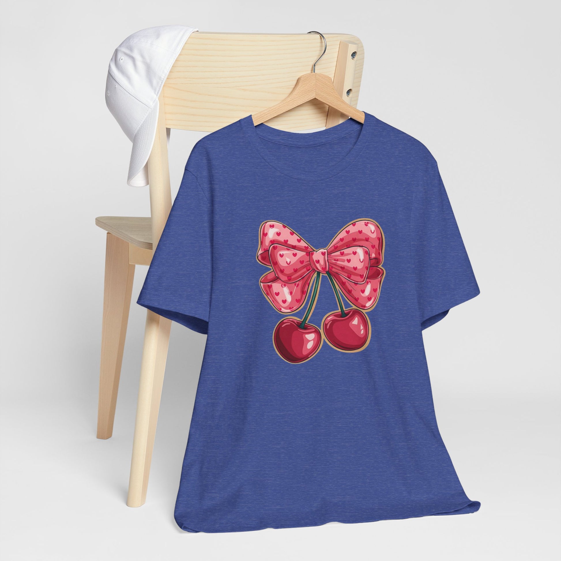Soft, breathable cotton with a playful, vintage-inspired cherry-and-bow artwork centered on the chest. Light and airy to wear on warm days or layered beneath a jacket. The design reads cute and nostalgic — like a hand-drawn sticker from a summer scrapbook — and sits cleanly on a classic crew neckline. It’s made to move with you: durable side seams, shoulder tape to prevent stretching, and a ribbed collar that keeps its shape wash after wash. Ethically produced blanks and a tear-away label keep this tee comfortable for all-day wear.