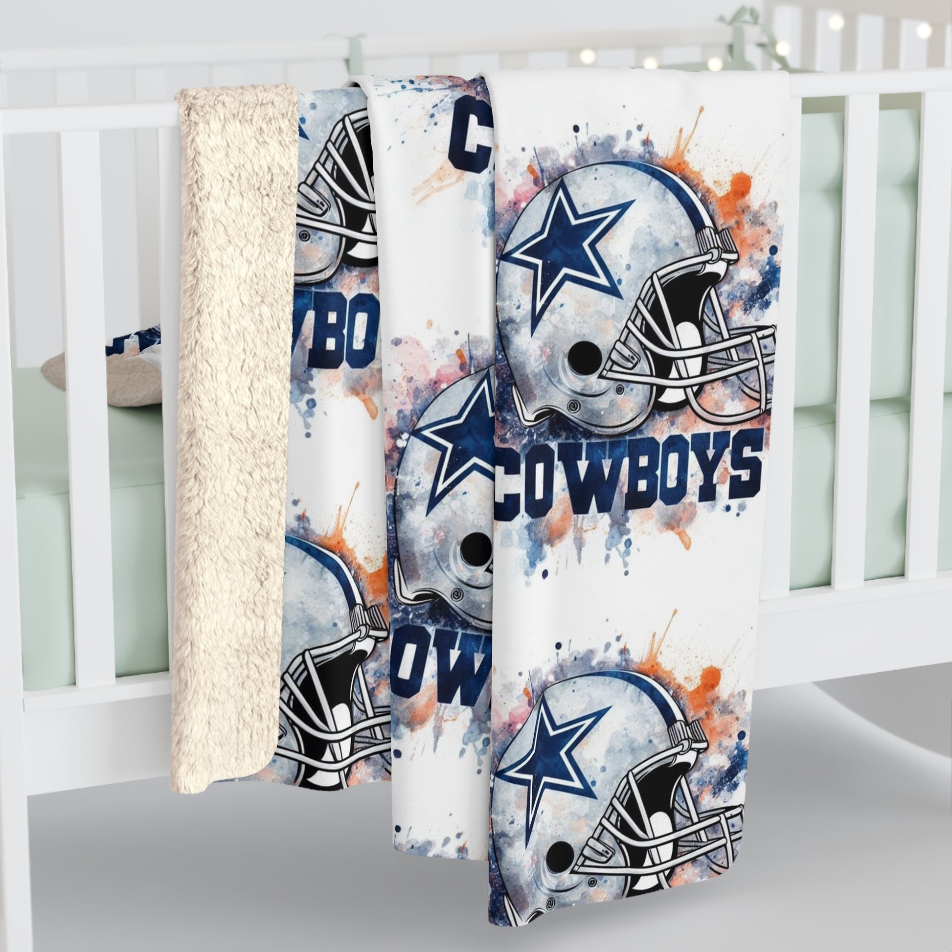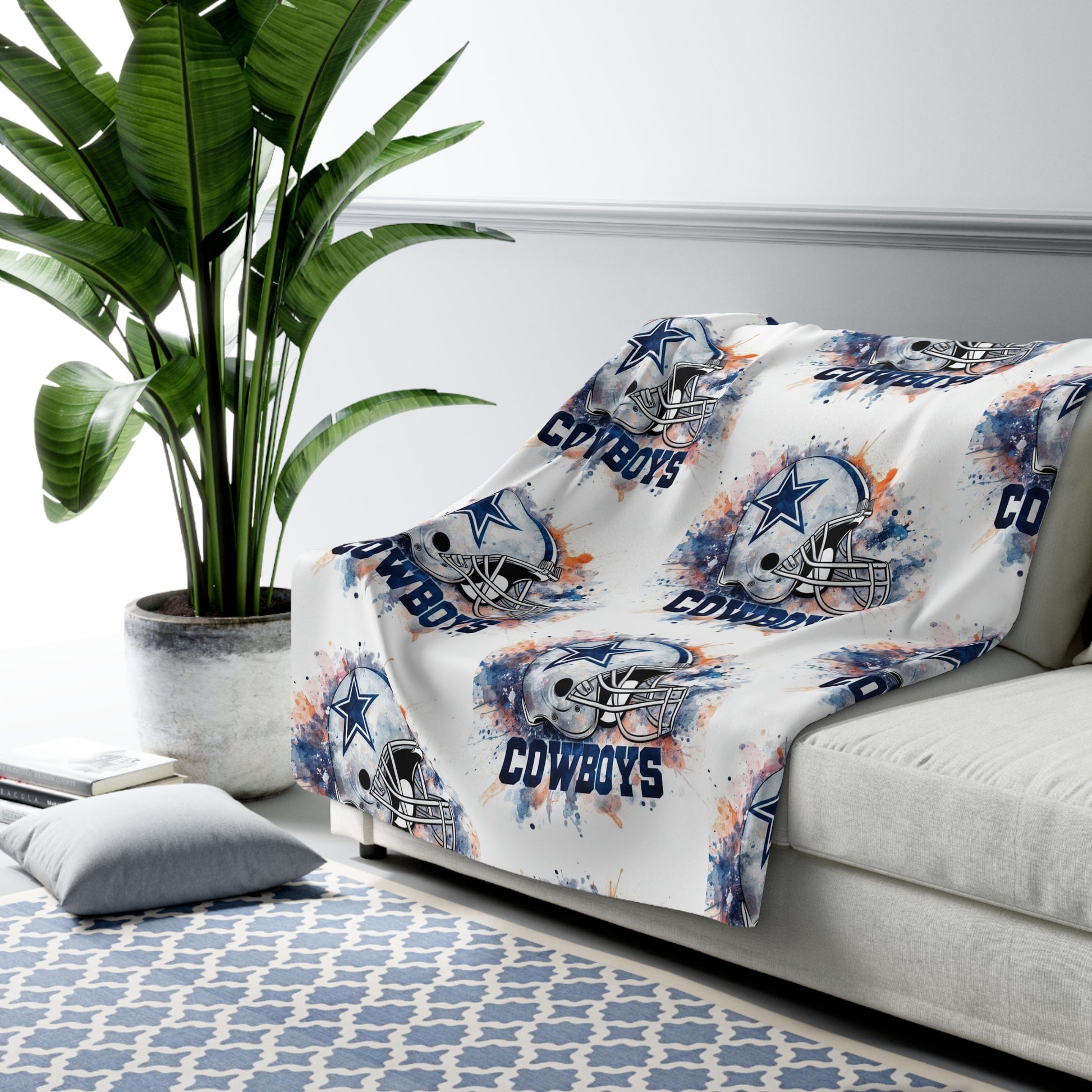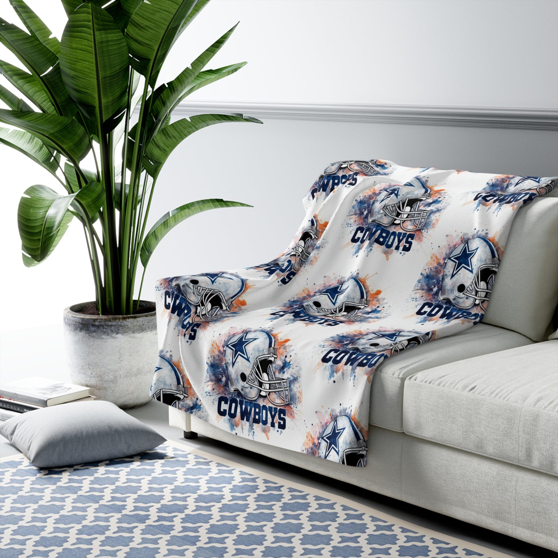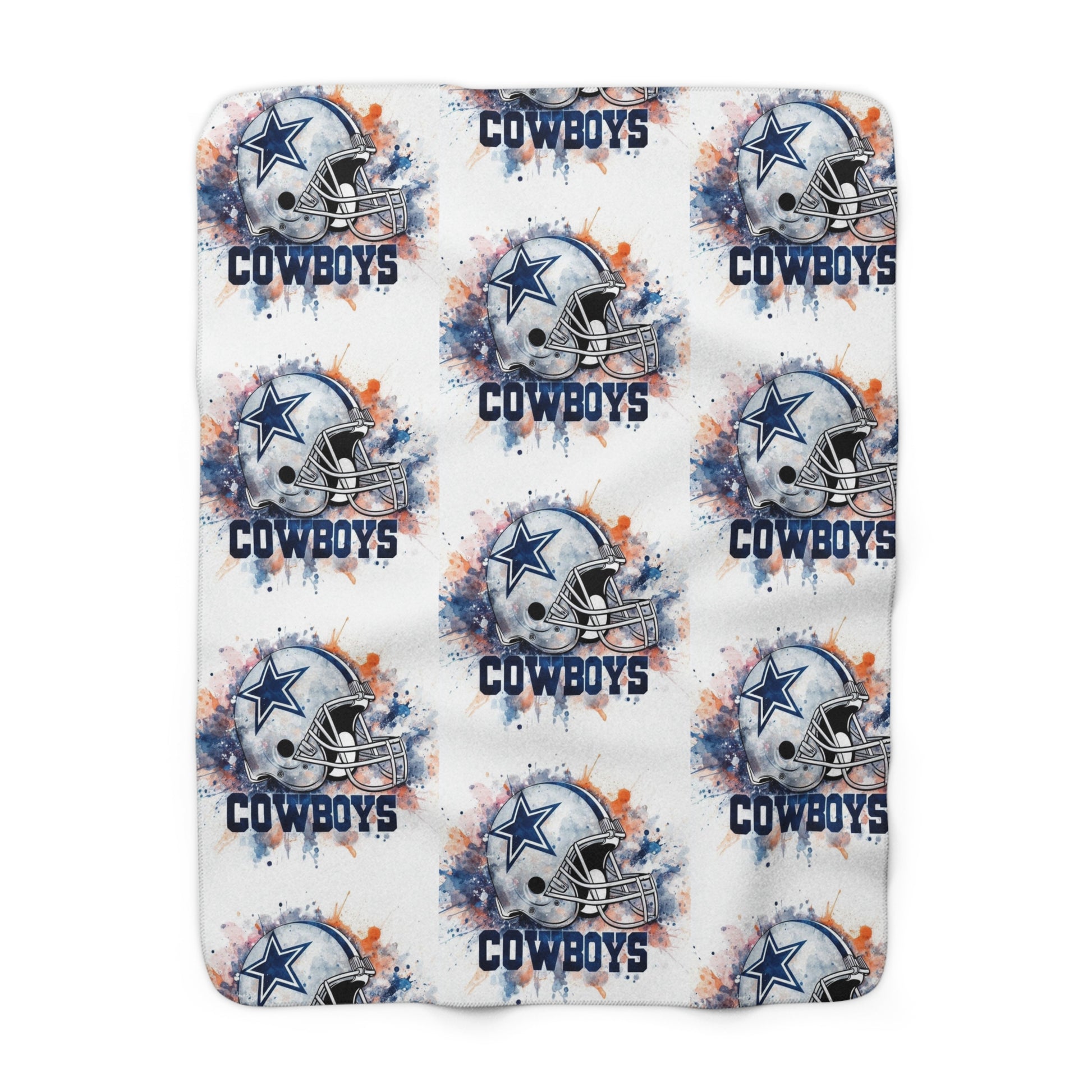 Wear your team pride into quiet moments. This plush sherpa fleece blanket wraps you in thick, velvety softness while a repeated watercolor-style helmet and team wordmark pattern brings game-day energy to your couch or recliner. It’s the kind of blanket you grab for chilly mornings with coffee, late-night watching parties, or for layering on the sofa when the air turns crisp. The fluffy sherpa reverse cushions your shoulders; the one-sided printed face keeps the artwork vibrant. Subtle distressing and splattered inks on the design give it a lived-in, vintage feel — familiar and energized at once.