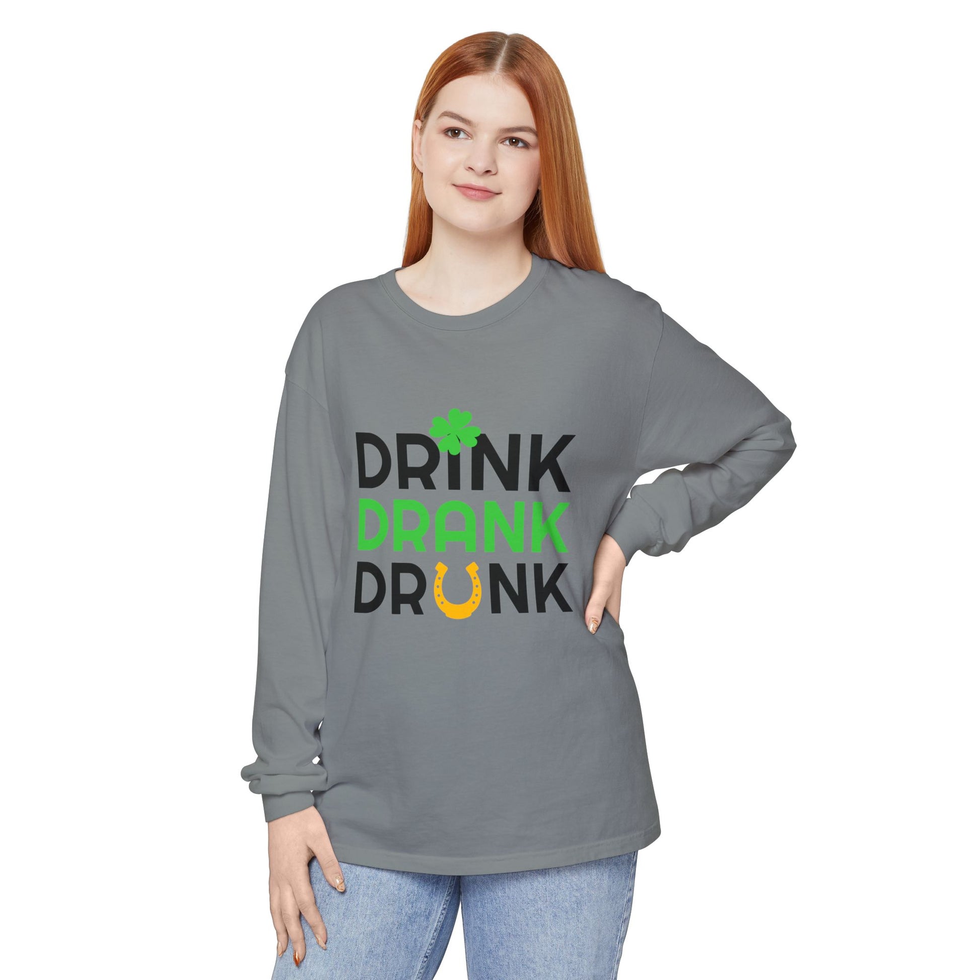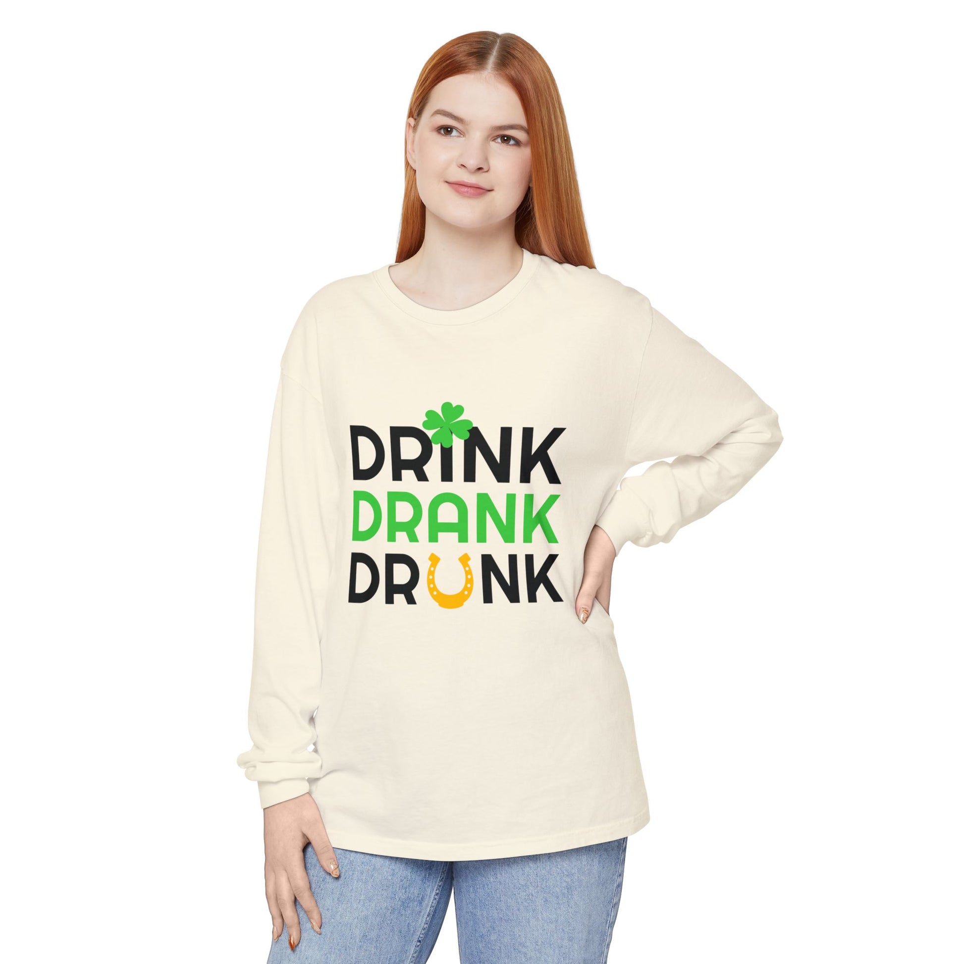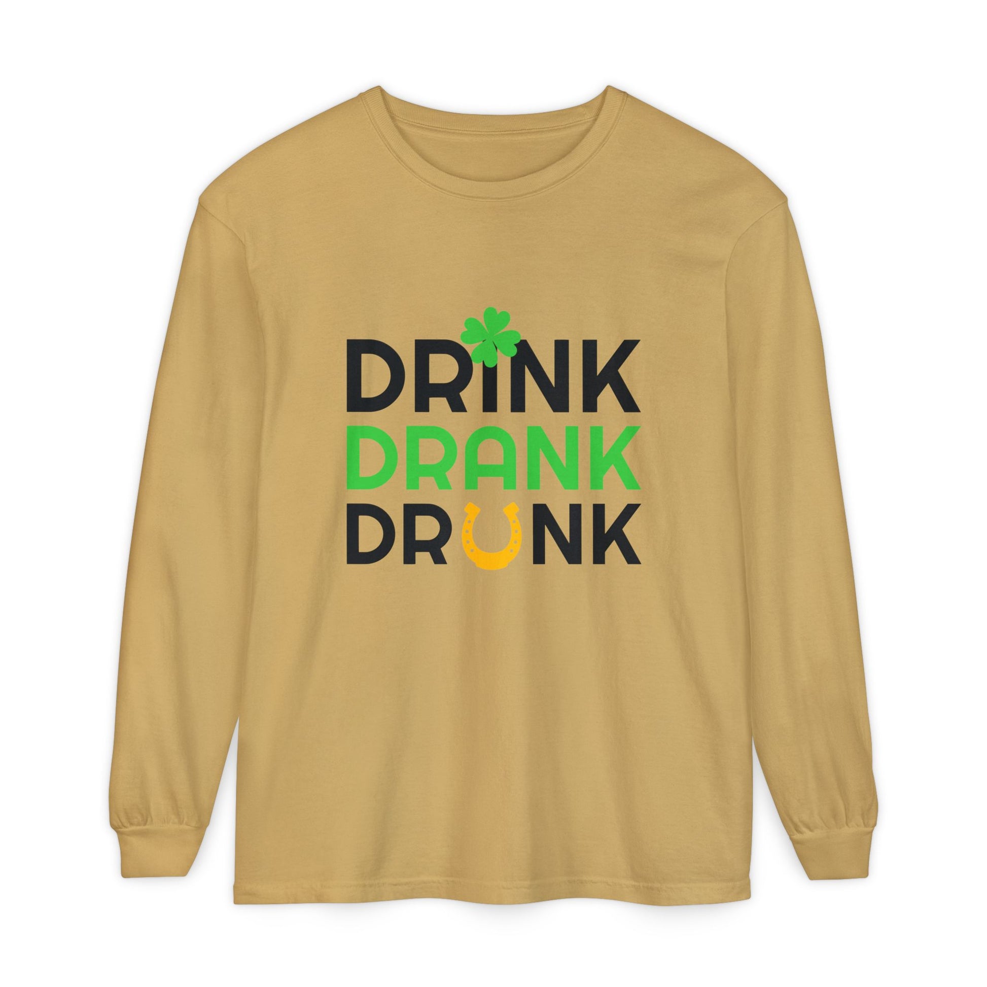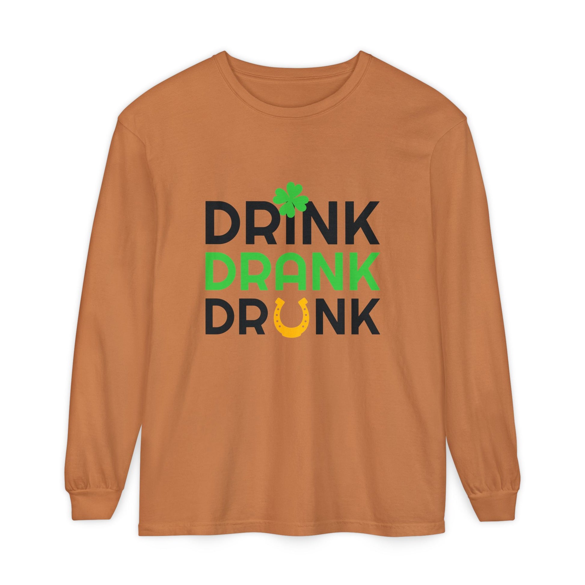 Drink Drank Drunk Shamrock Horseshoe Long Sleeve Tee | St. Patrick's Day Shirt