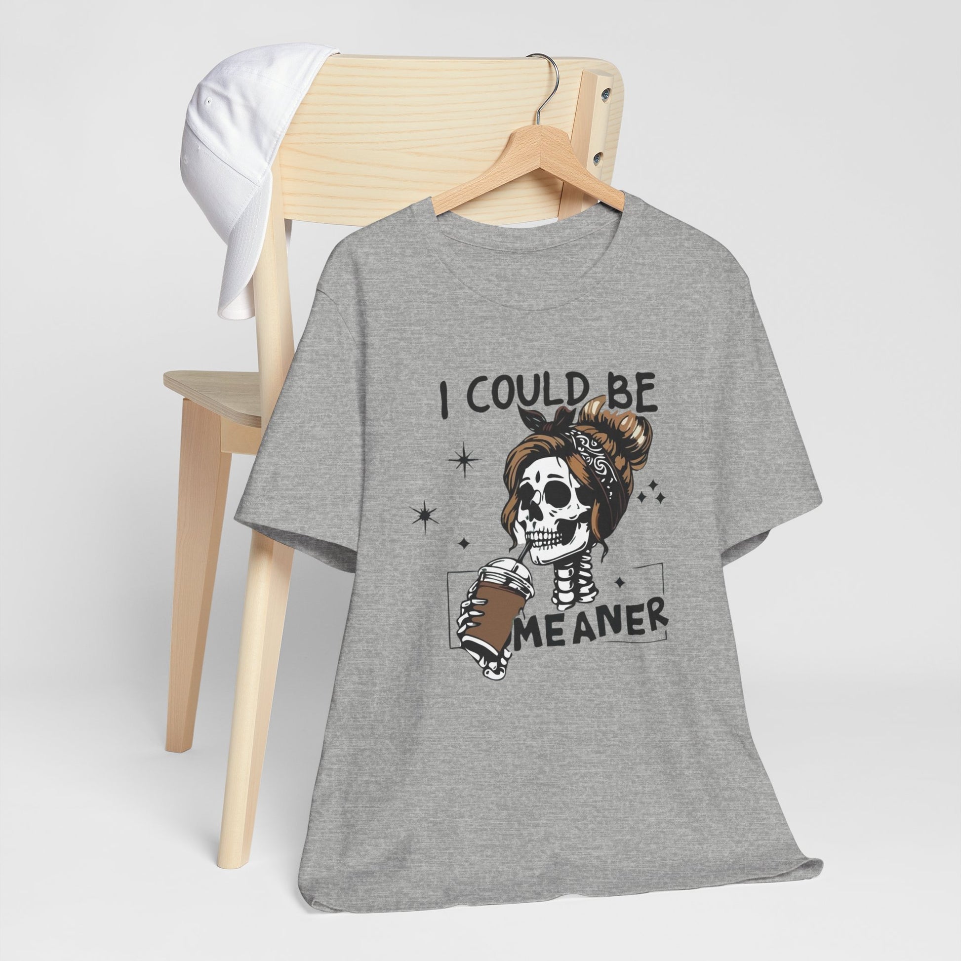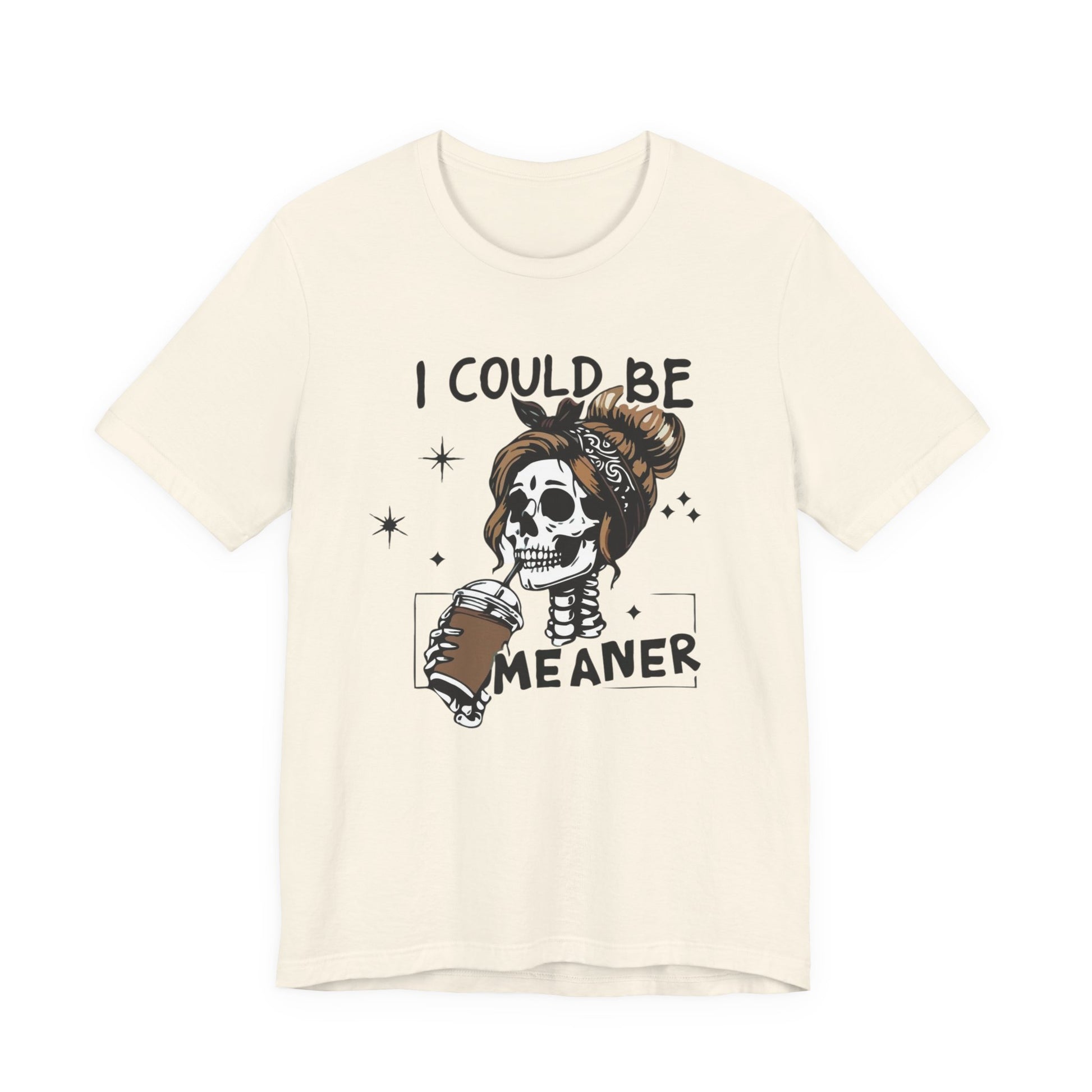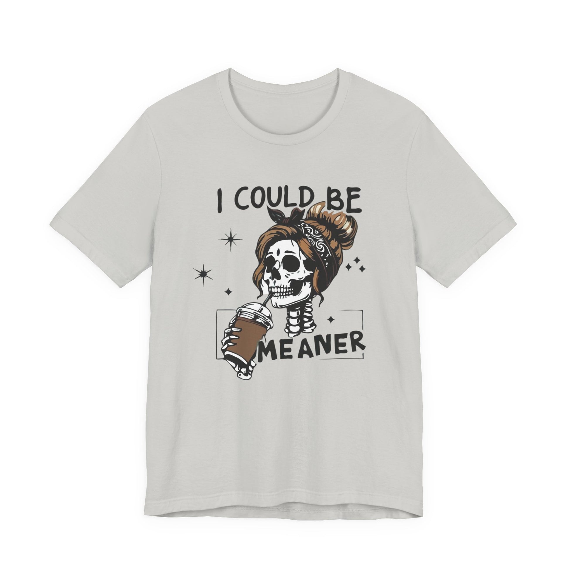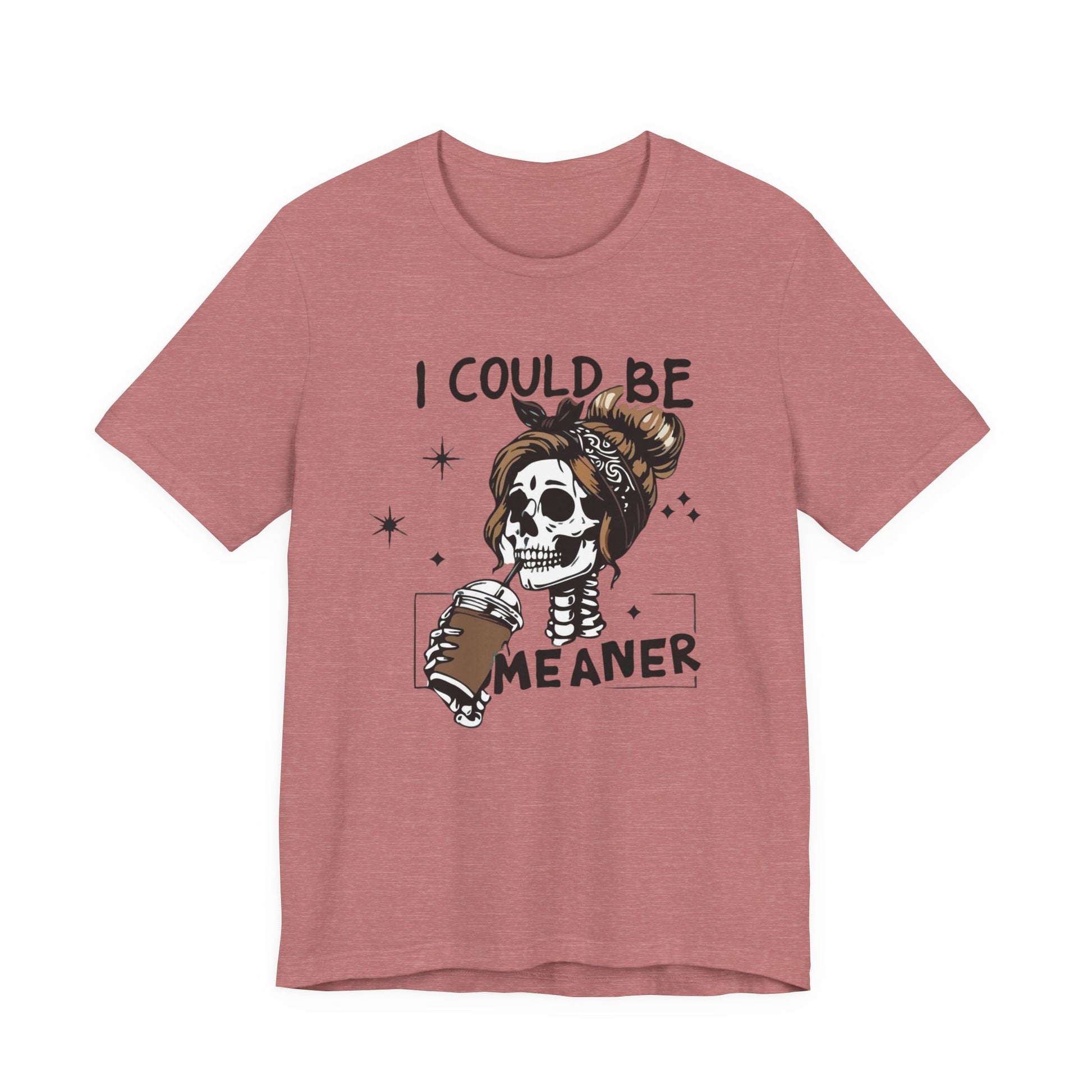 Lightweight and breathable, this jersey tee wears like your favorite go-to layer while carrying a playful, edgy vibe. The front artwork — a stylized skull with a messy bun holding a coffee and the cheeky line “I could be meaner” — balances dark-humor charm with everyday comfort. Side seams and shoulder tape keep the shirt’s shape through washes. A ribbed knit crew neck and tear-away label add comfort and easy styling. Thoughtfully made from Airlume combed ring-spun cotton and responsibly manufactured, it’s an effortless piece that slips into casual outfits, coffee runs, and laid-back hangouts.