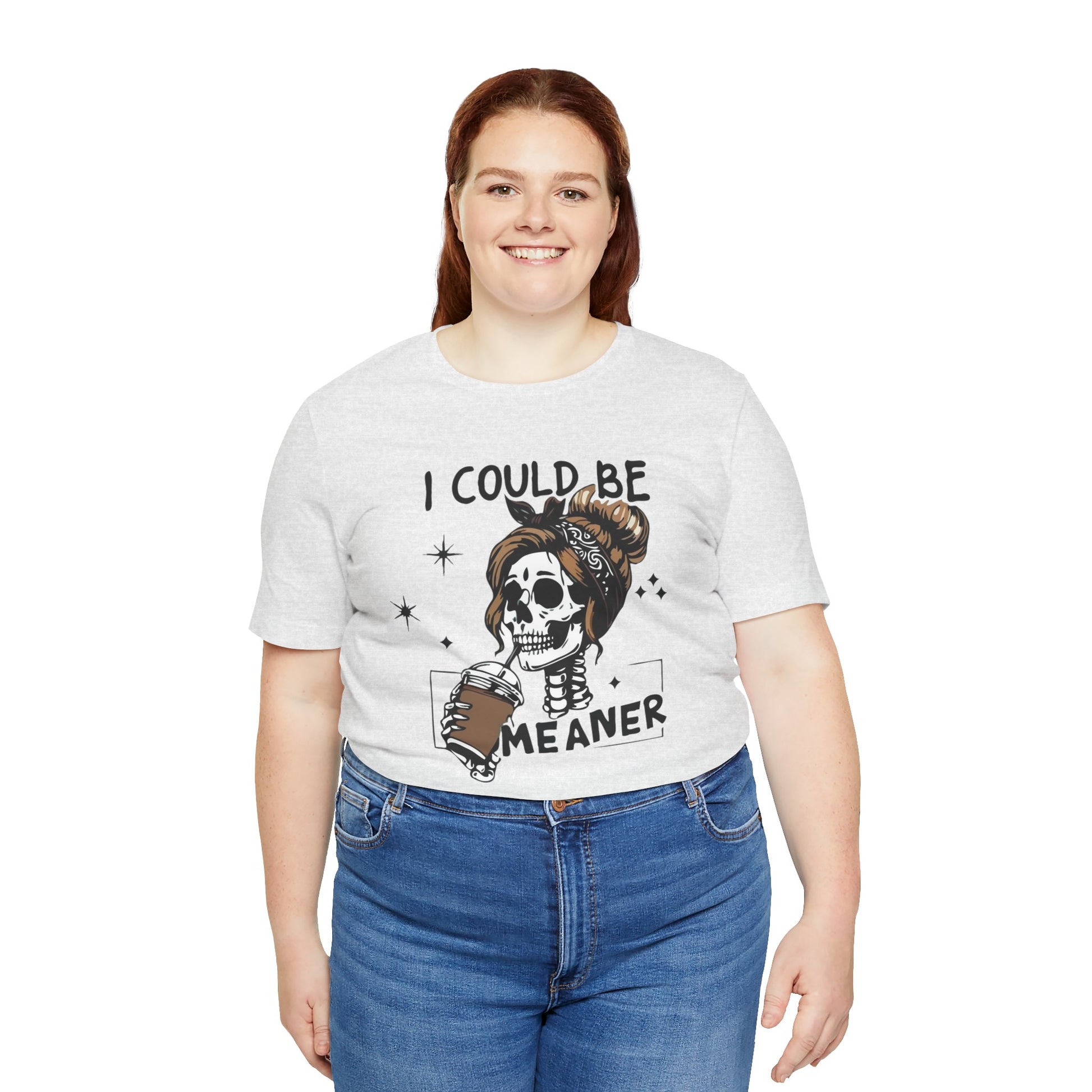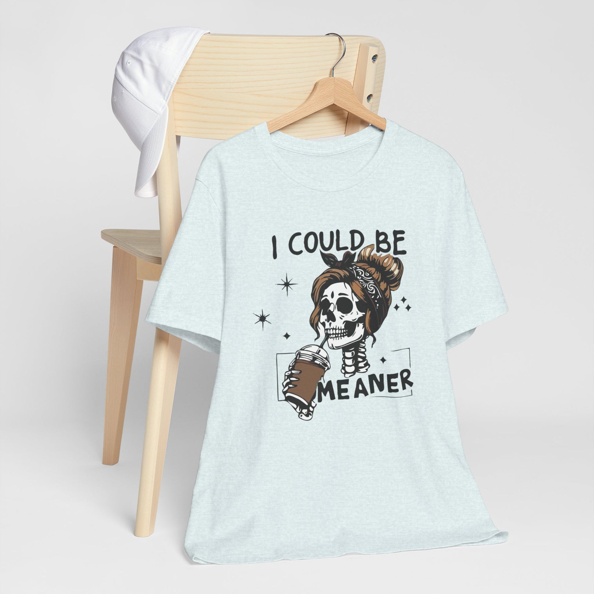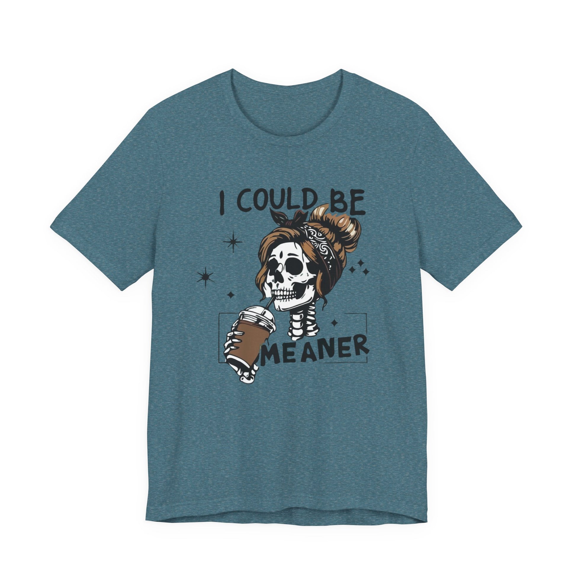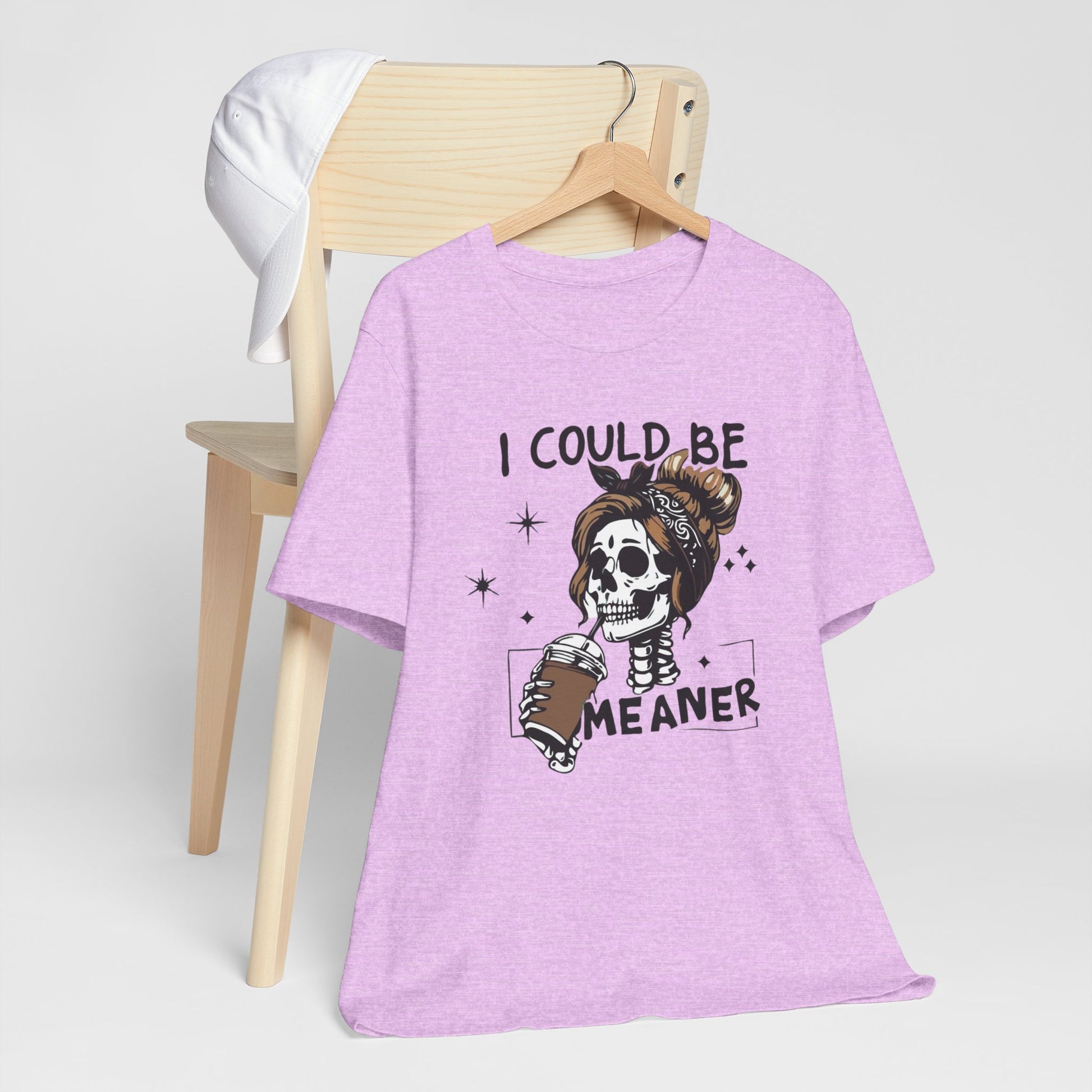 Lightweight and breathable, this jersey tee wears like your favorite go-to layer while carrying a playful, edgy vibe. The front artwork — a stylized skull with a messy bun holding a coffee and the cheeky line “I could be meaner” — balances dark-humor charm with everyday comfort. Side seams and shoulder tape keep the shirt’s shape through washes. A ribbed knit crew neck and tear-away label add comfort and easy styling. Thoughtfully made from Airlume combed ring-spun cotton and responsibly manufactured, it’s an effortless piece that slips into casual outfits, coffee runs, and laid-back hangouts.