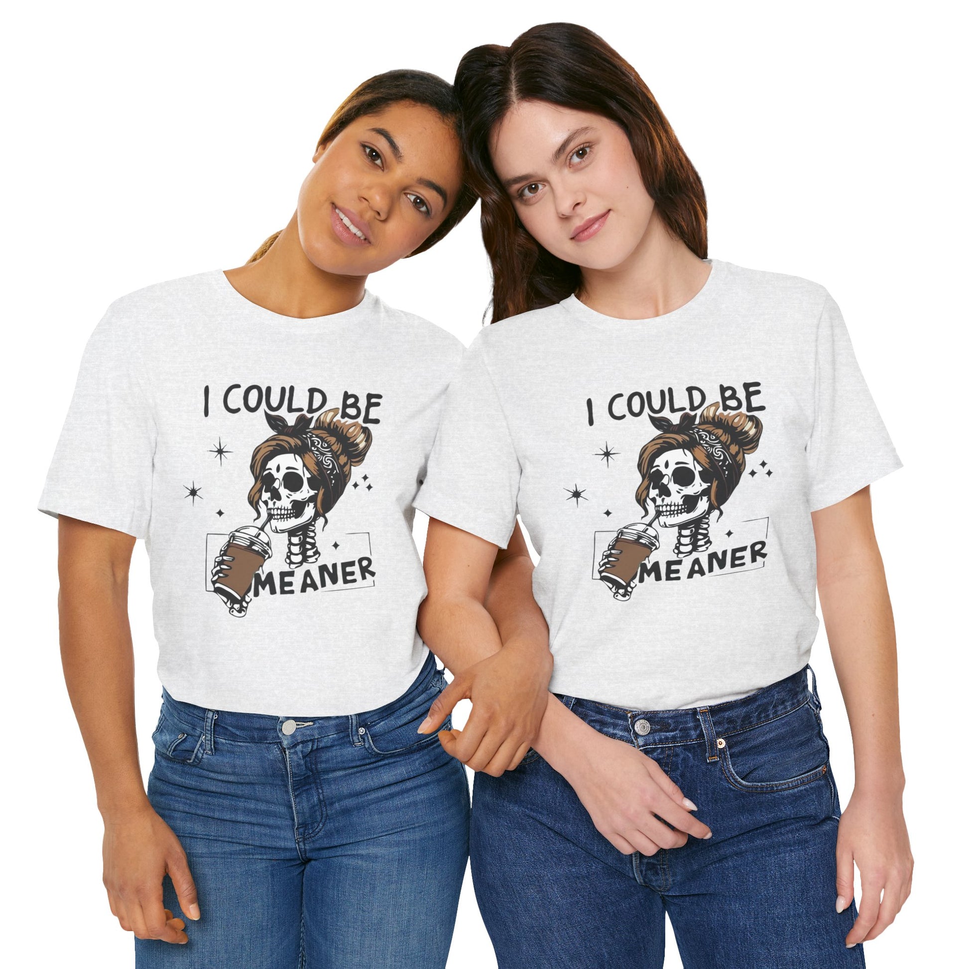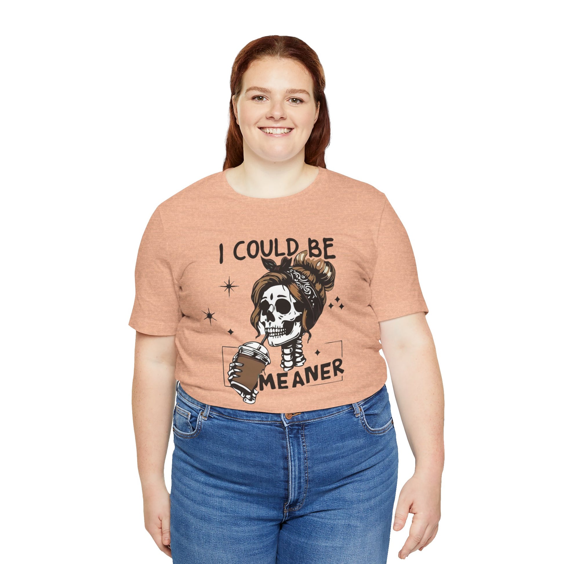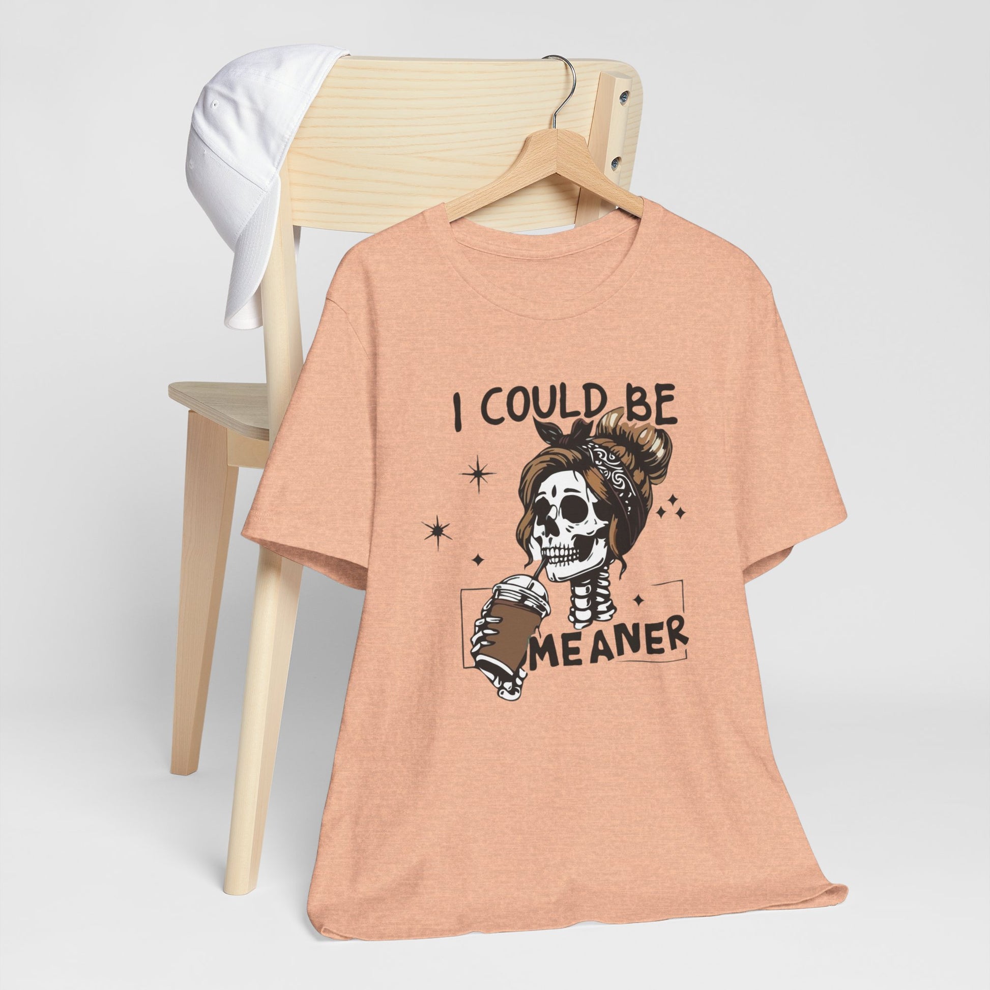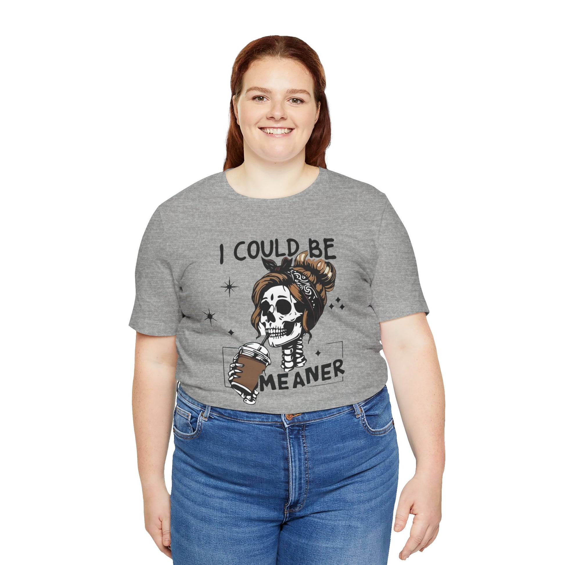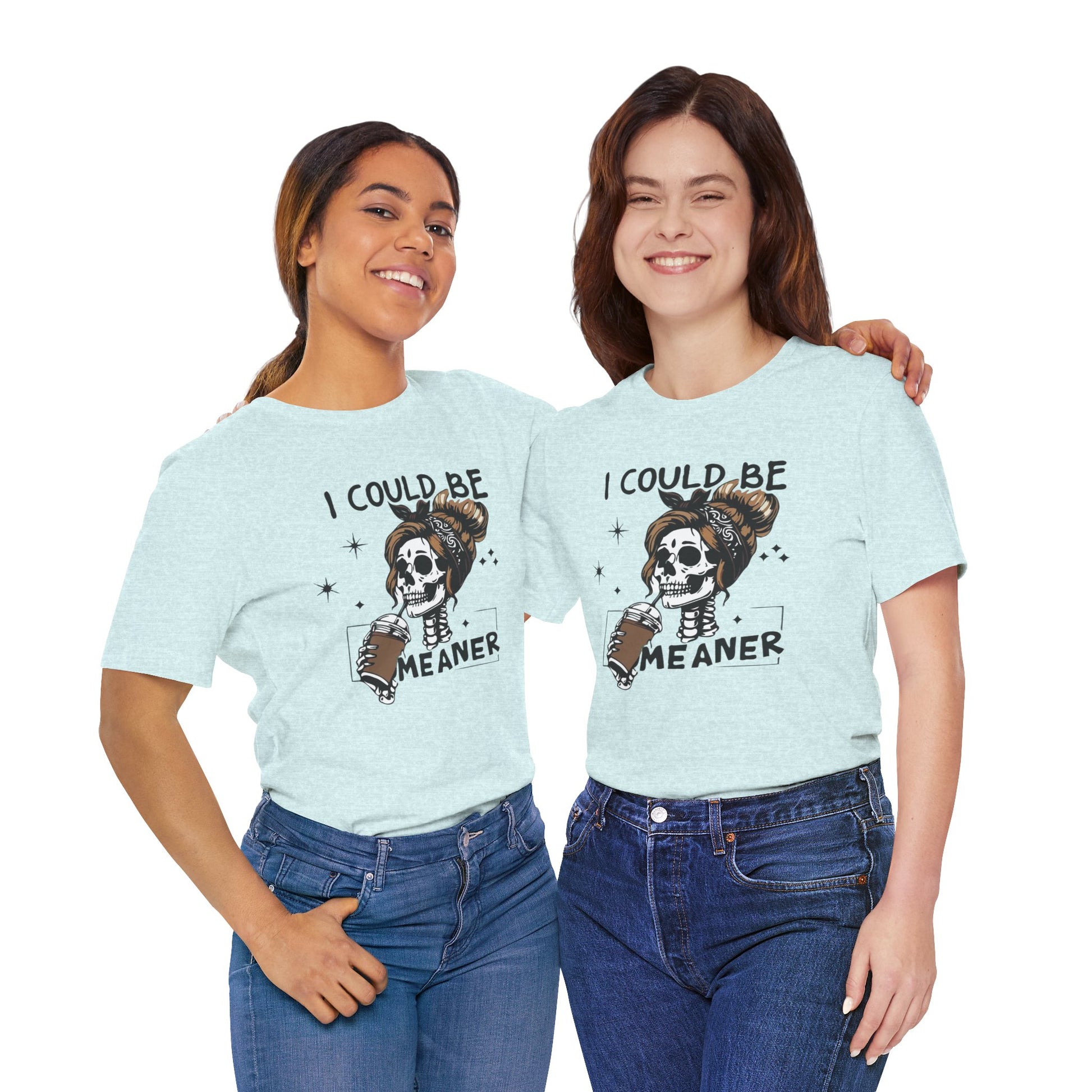 Lightweight and breathable, this jersey tee wears like your favorite go-to layer while carrying a playful, edgy vibe. The front artwork — a stylized skull with a messy bun holding a coffee and the cheeky line “I could be meaner” — balances dark-humor charm with everyday comfort. Side seams and shoulder tape keep the shirt’s shape through washes. A ribbed knit crew neck and tear-away label add comfort and easy styling. Thoughtfully made from Airlume combed ring-spun cotton and responsibly manufactured, it’s an effortless piece that slips into casual outfits, coffee runs, and laid-back hangouts.