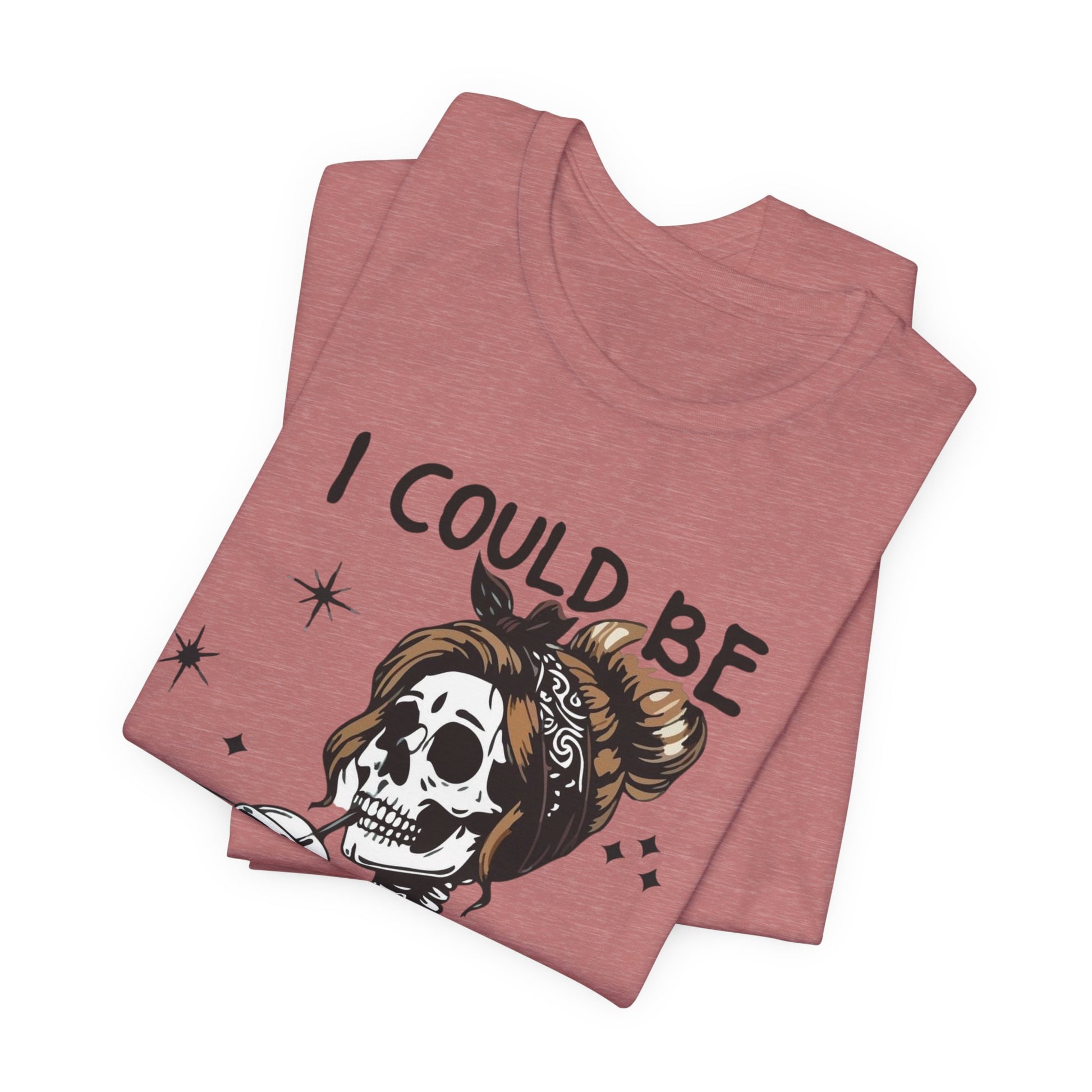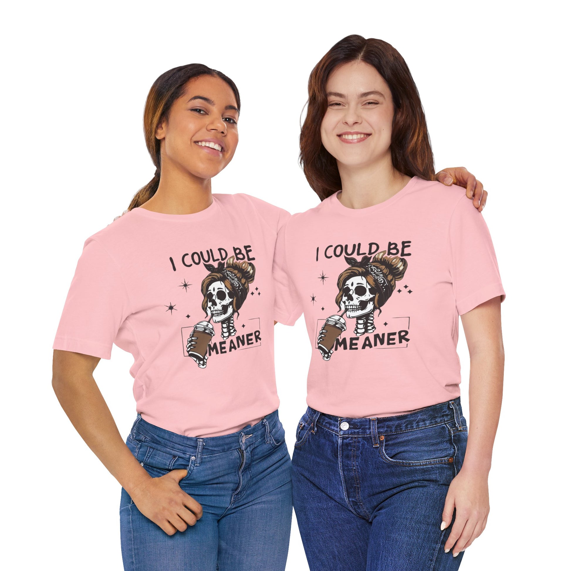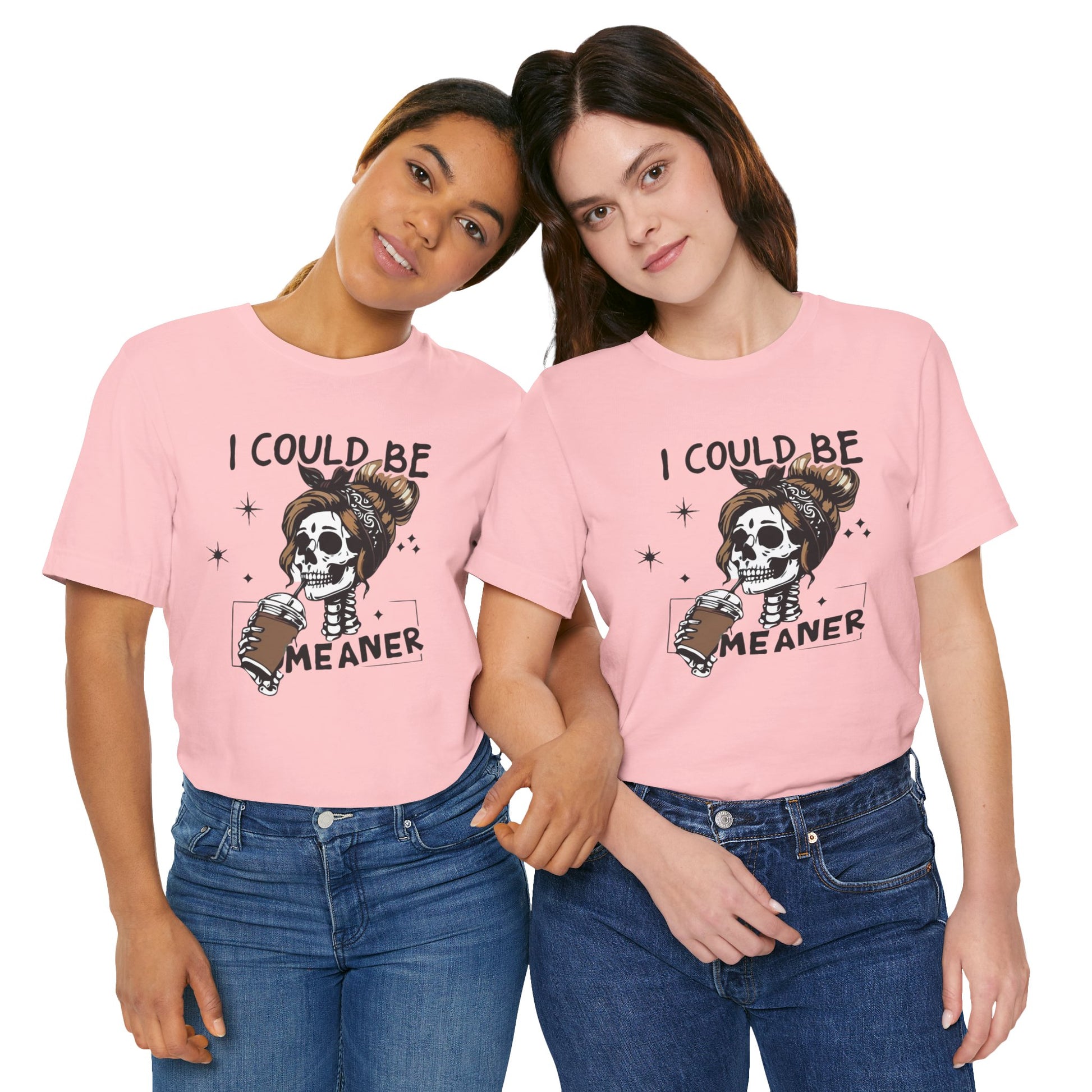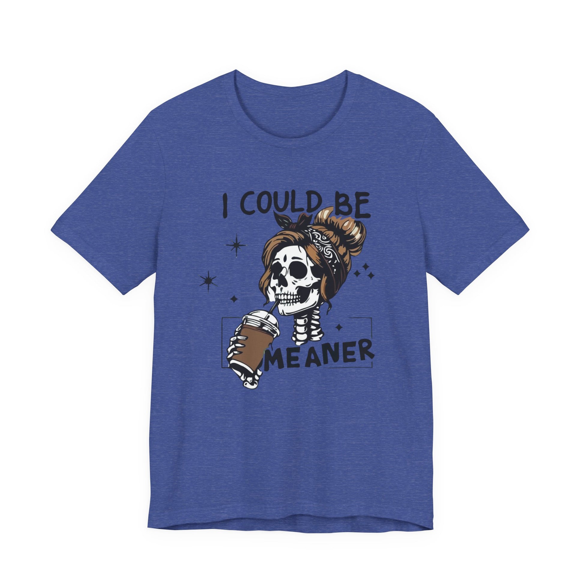 Lightweight and breathable, this jersey tee wears like your favorite go-to layer while carrying a playful, edgy vibe. The front artwork — a stylized skull with a messy bun holding a coffee and the cheeky line “I could be meaner” — balances dark-humor charm with everyday comfort. Side seams and shoulder tape keep the shirt’s shape through washes. A ribbed knit crew neck and tear-away label add comfort and easy styling. Thoughtfully made from Airlume combed ring-spun cotton and responsibly manufactured, it’s an effortless piece that slips into casual outfits, coffee runs, and laid-back hangouts.