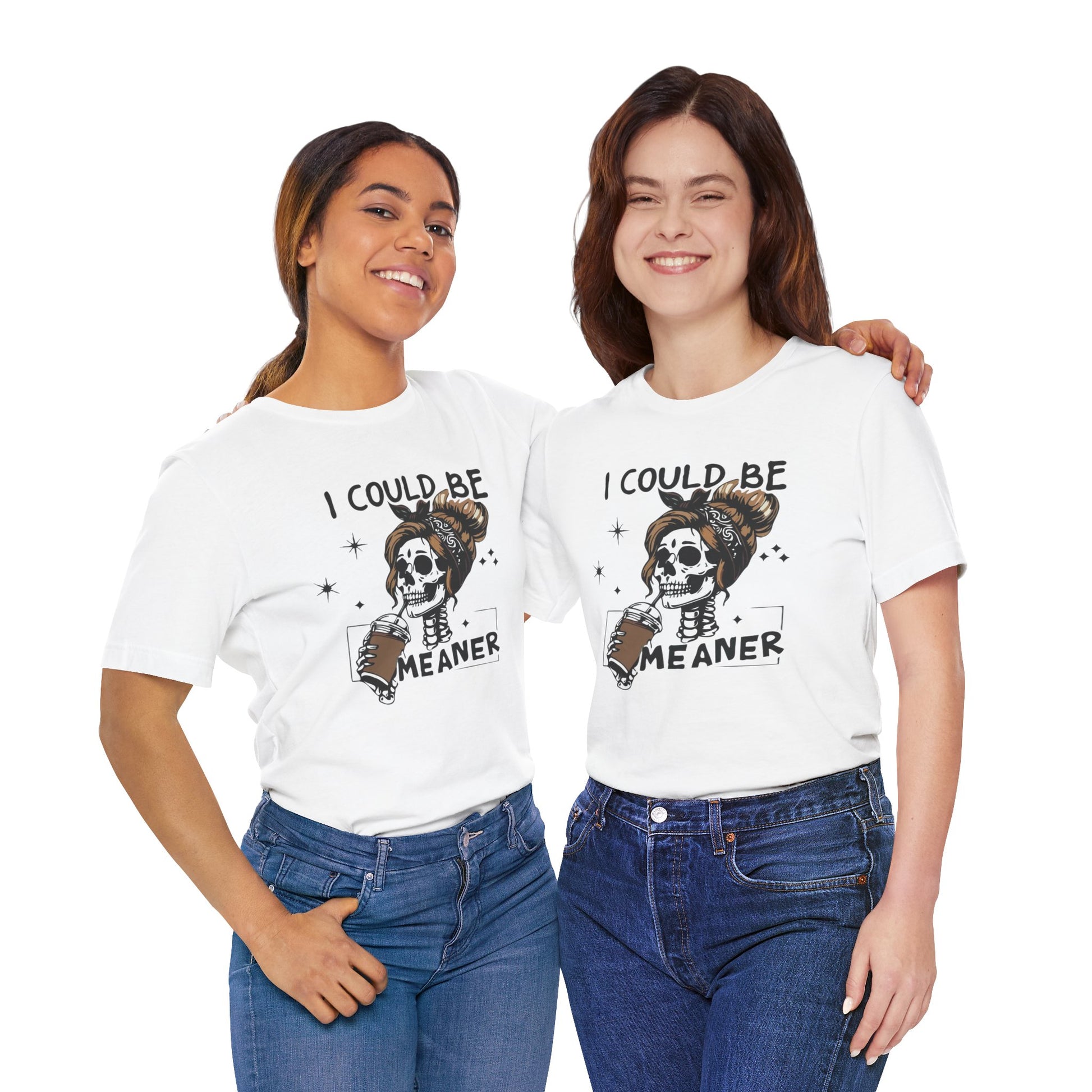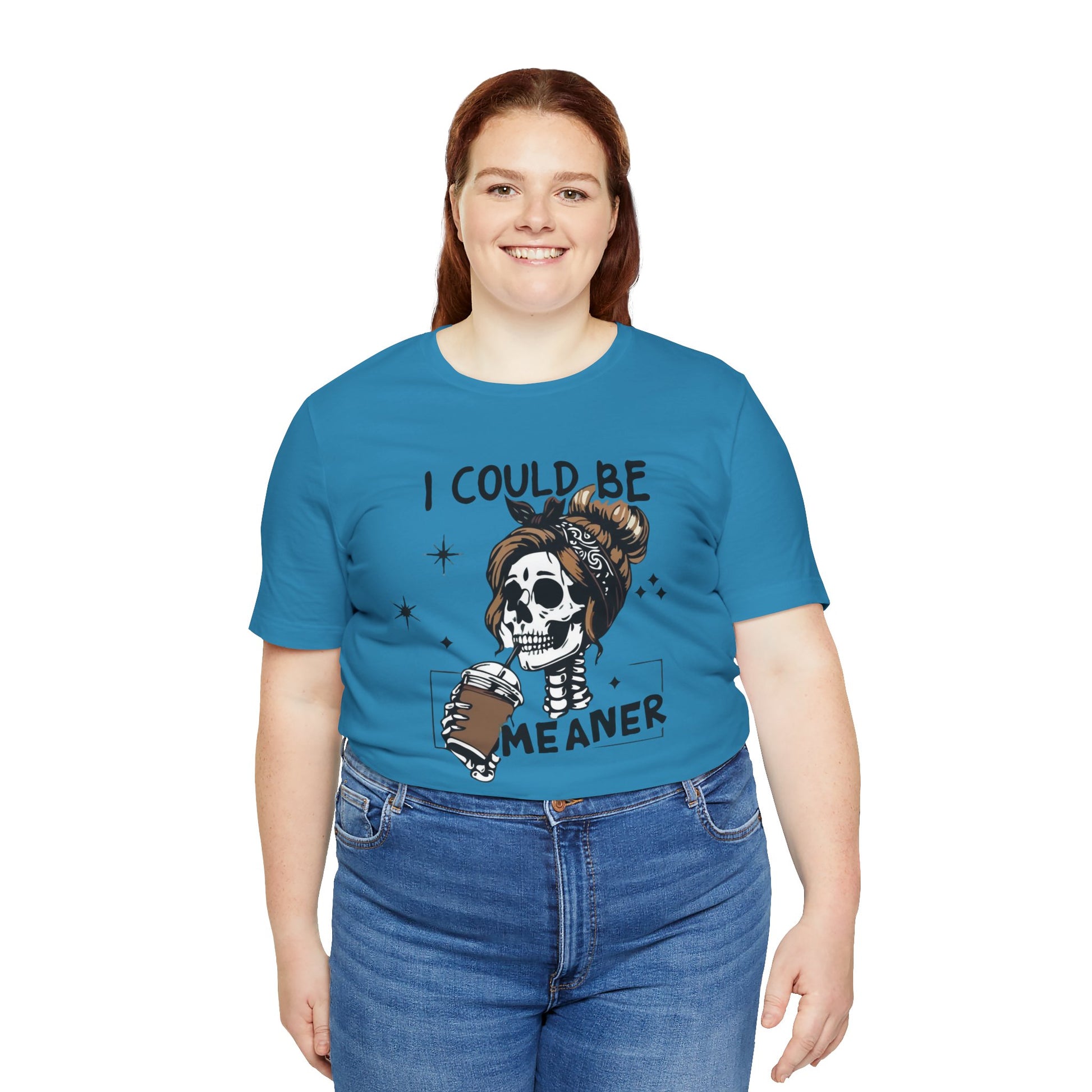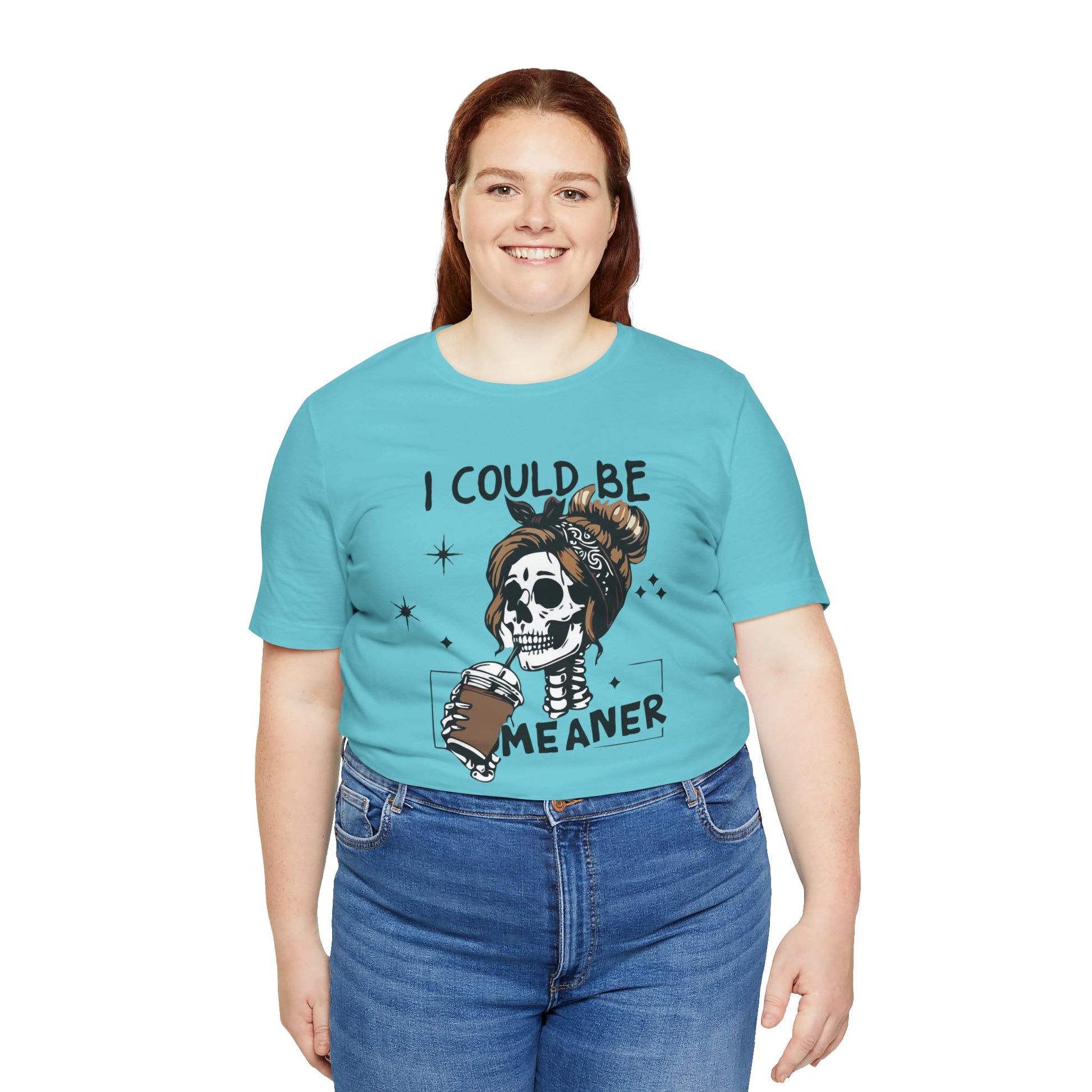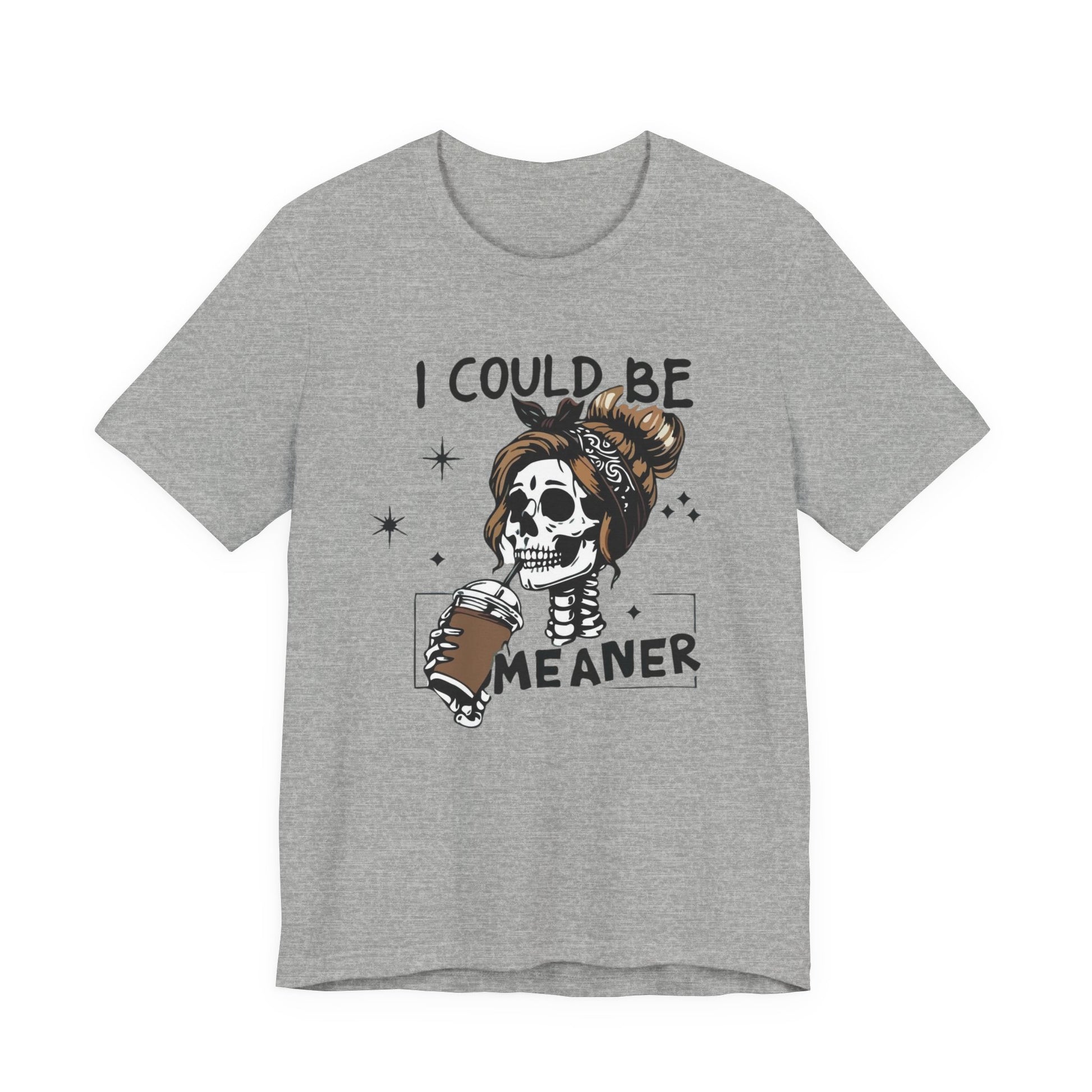 I Could Be Meaner skeleton with coffee T-Shirt | Skull woman graphic tee