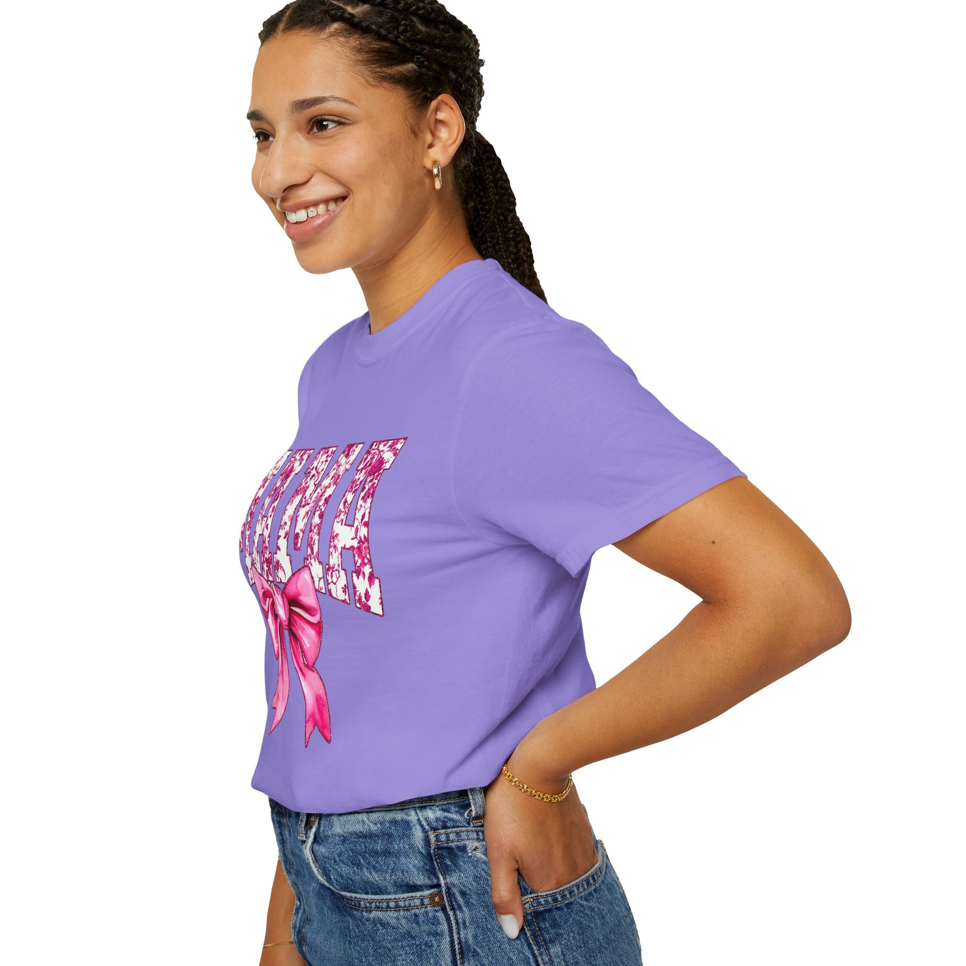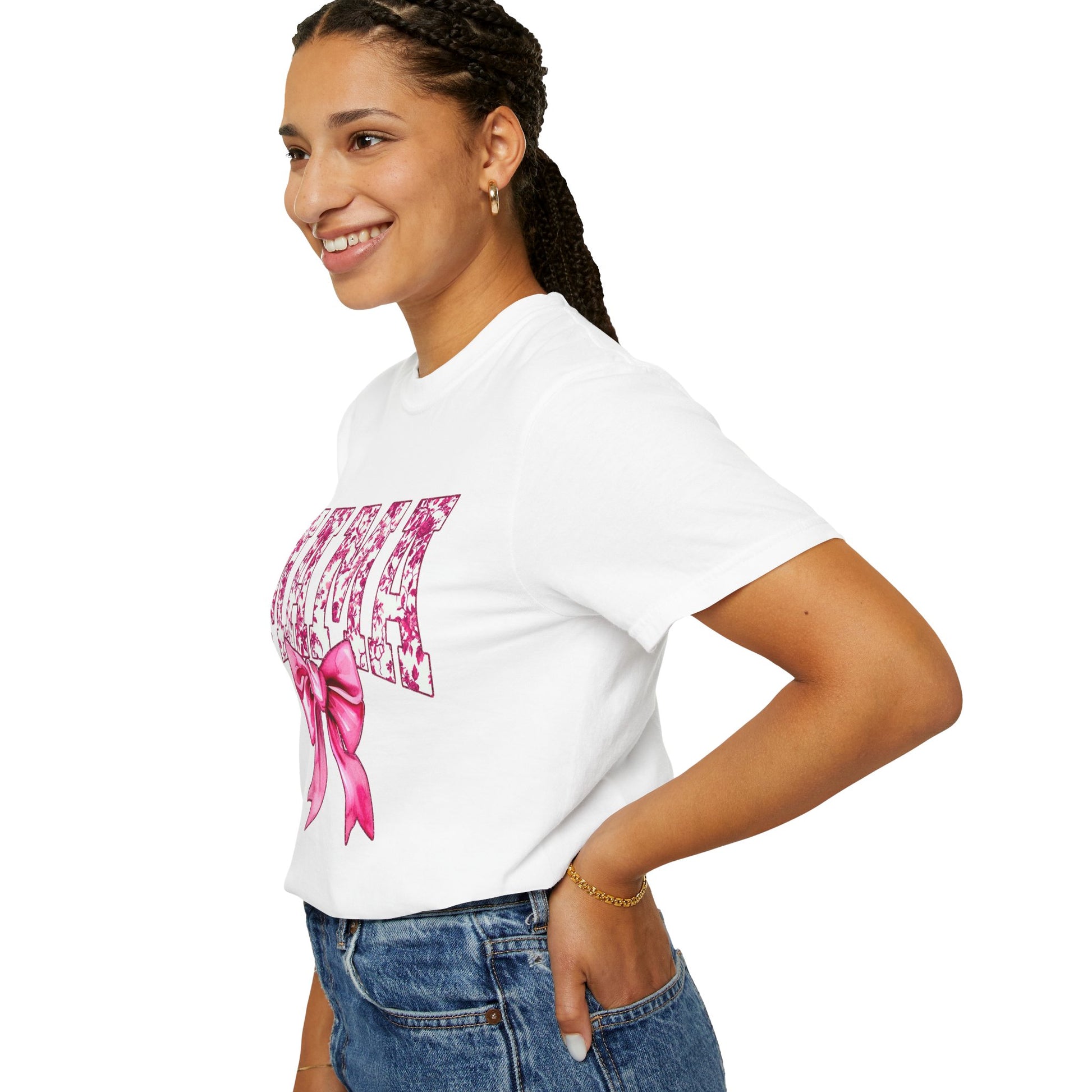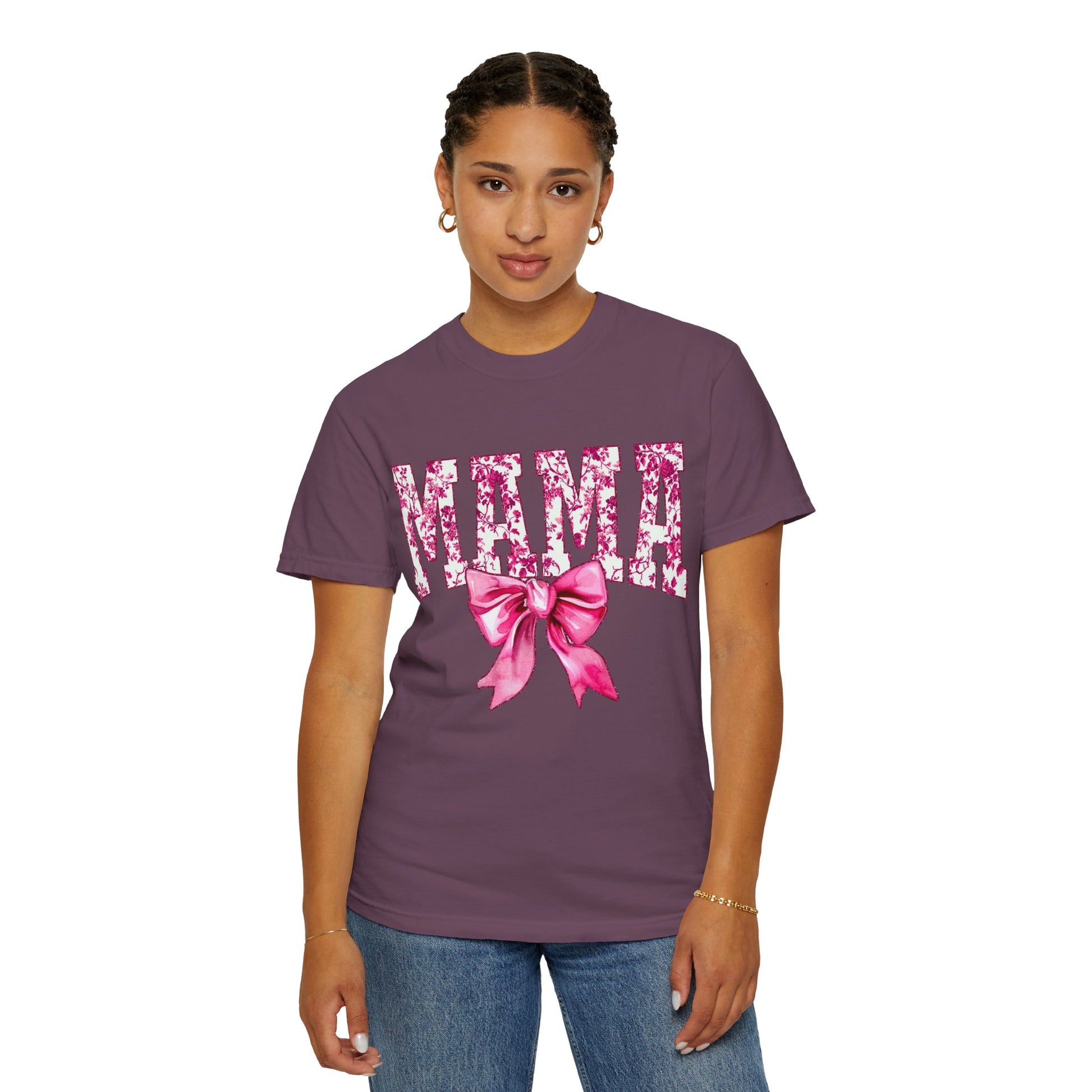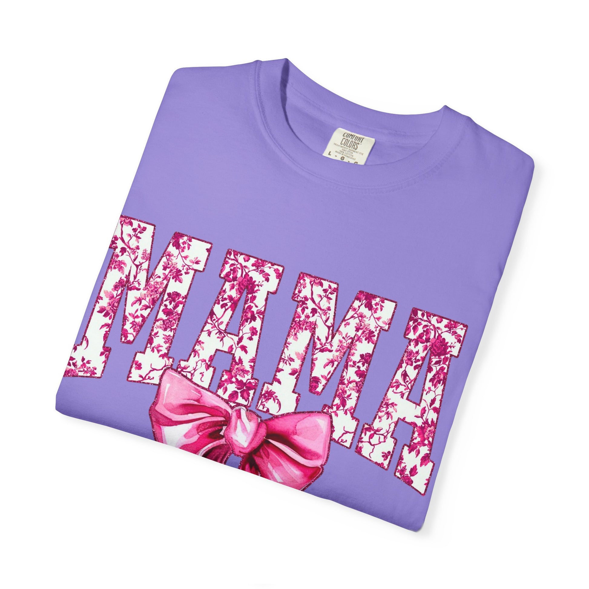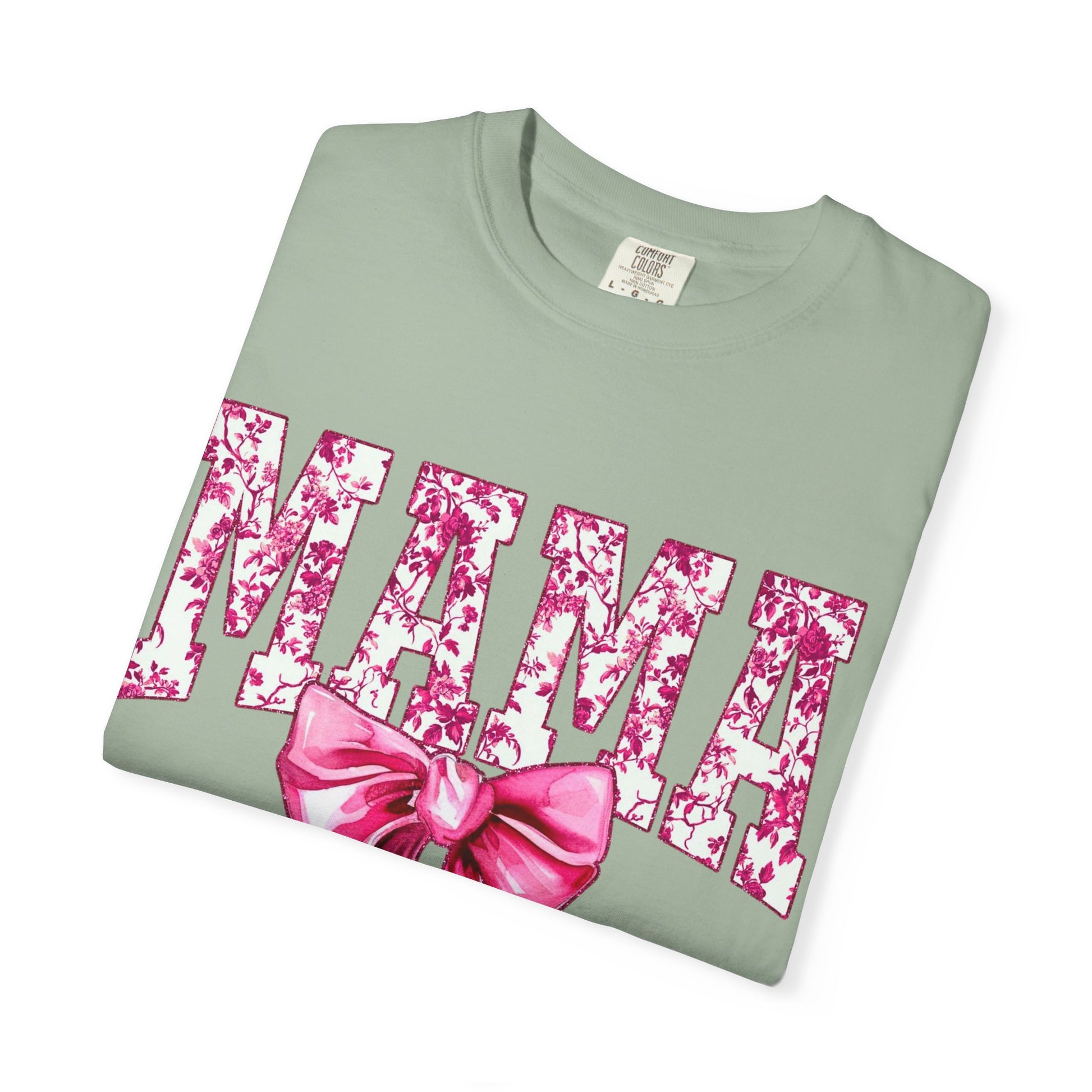Soft, sturdy, and quietly feminine — this garment-dyed tee wears like a lived-in favorite. The bold “MAMA” headline is filled with a delicate floral motif and anchored by a hand-painted pink bow, so the shirt reads like a warm, everyday declaration rather than loud branding. The heavyweight 100% ring-spun cotton and relaxed cut make it great for slow mornings with coffee, school runs, park days, or wrapping up after a long day. It sits naturally over jeans or lounge pants and returns to shape thanks to pre-shrunk fabric and thoughtful construction. Choose from a wide palette of colors to match a personal vibe or celebration.