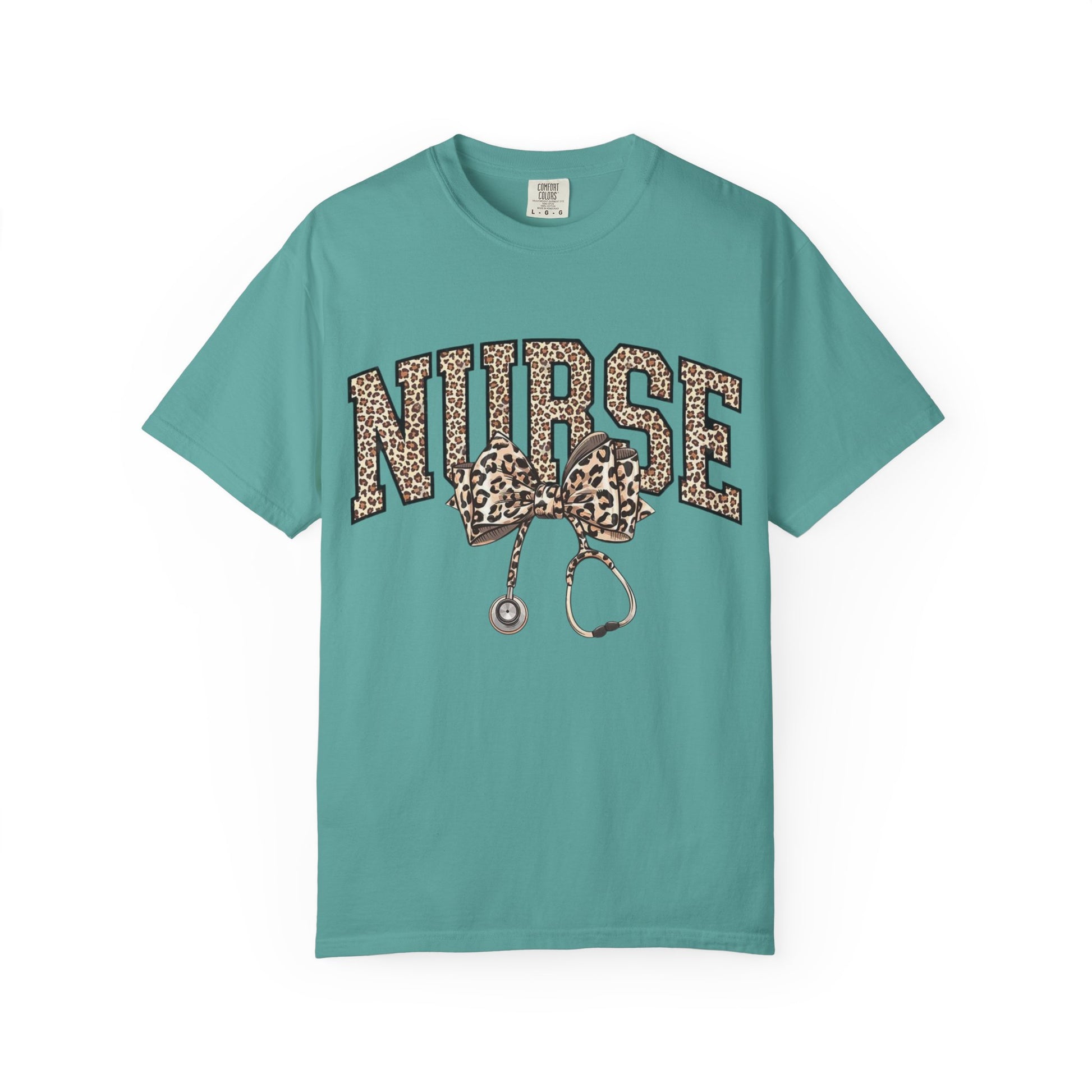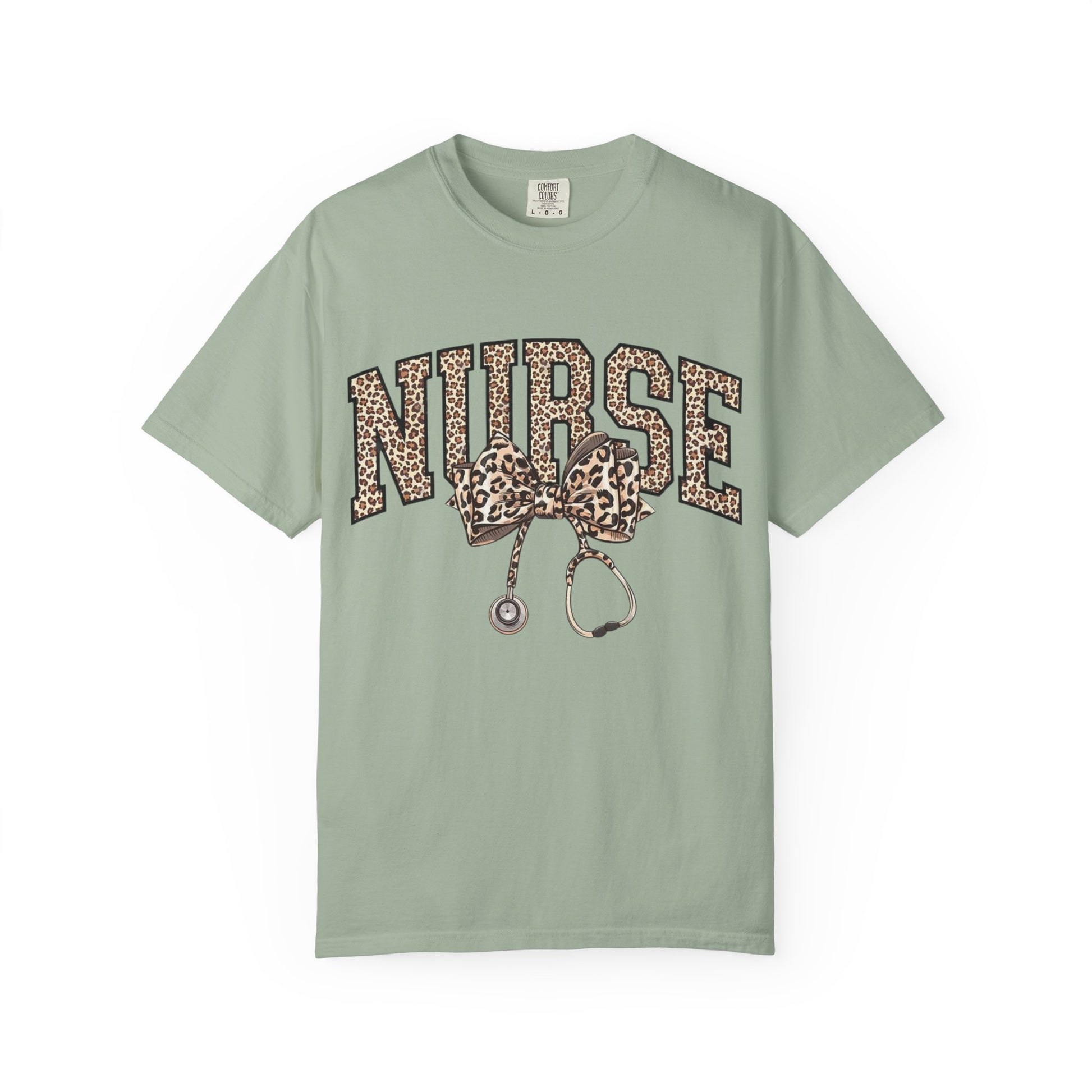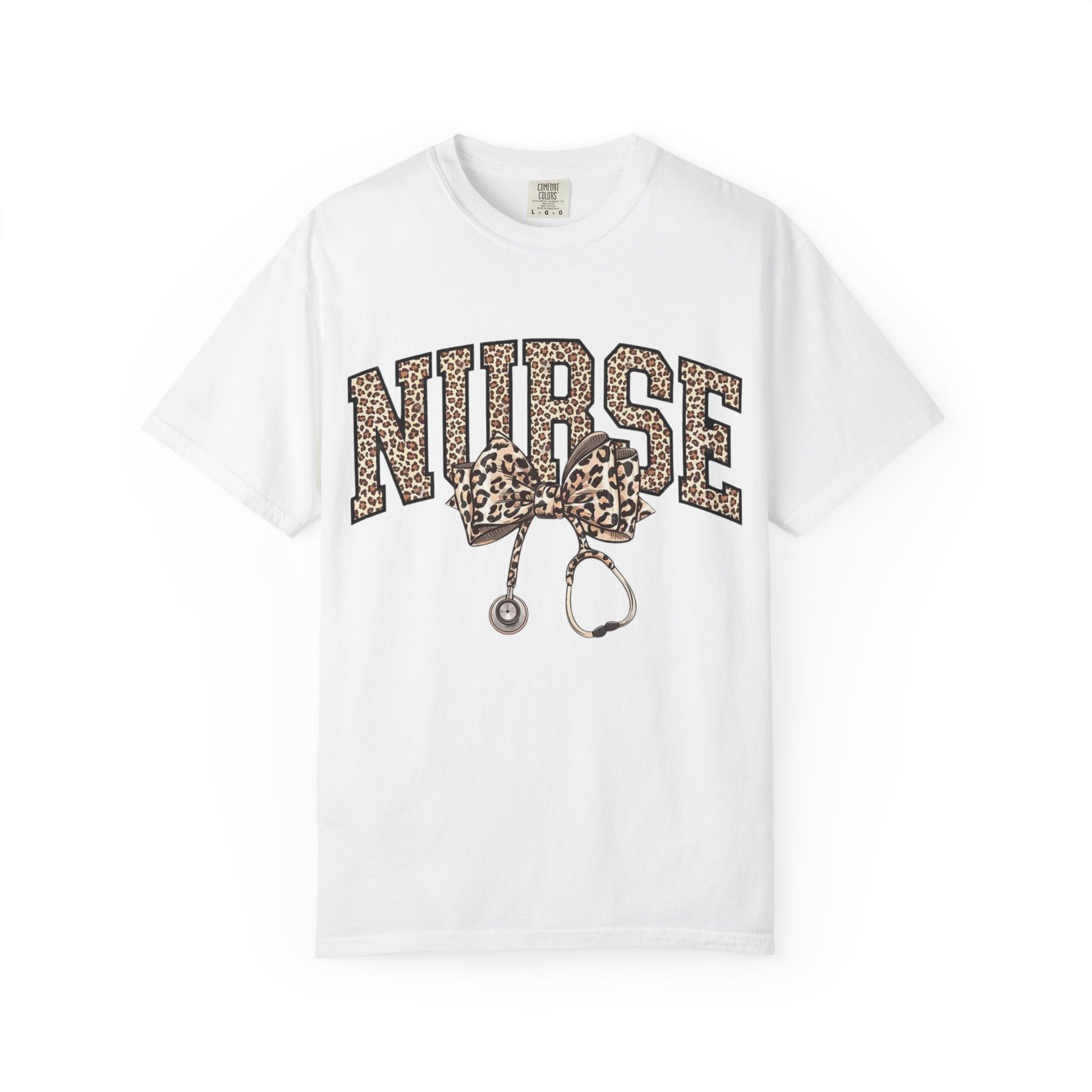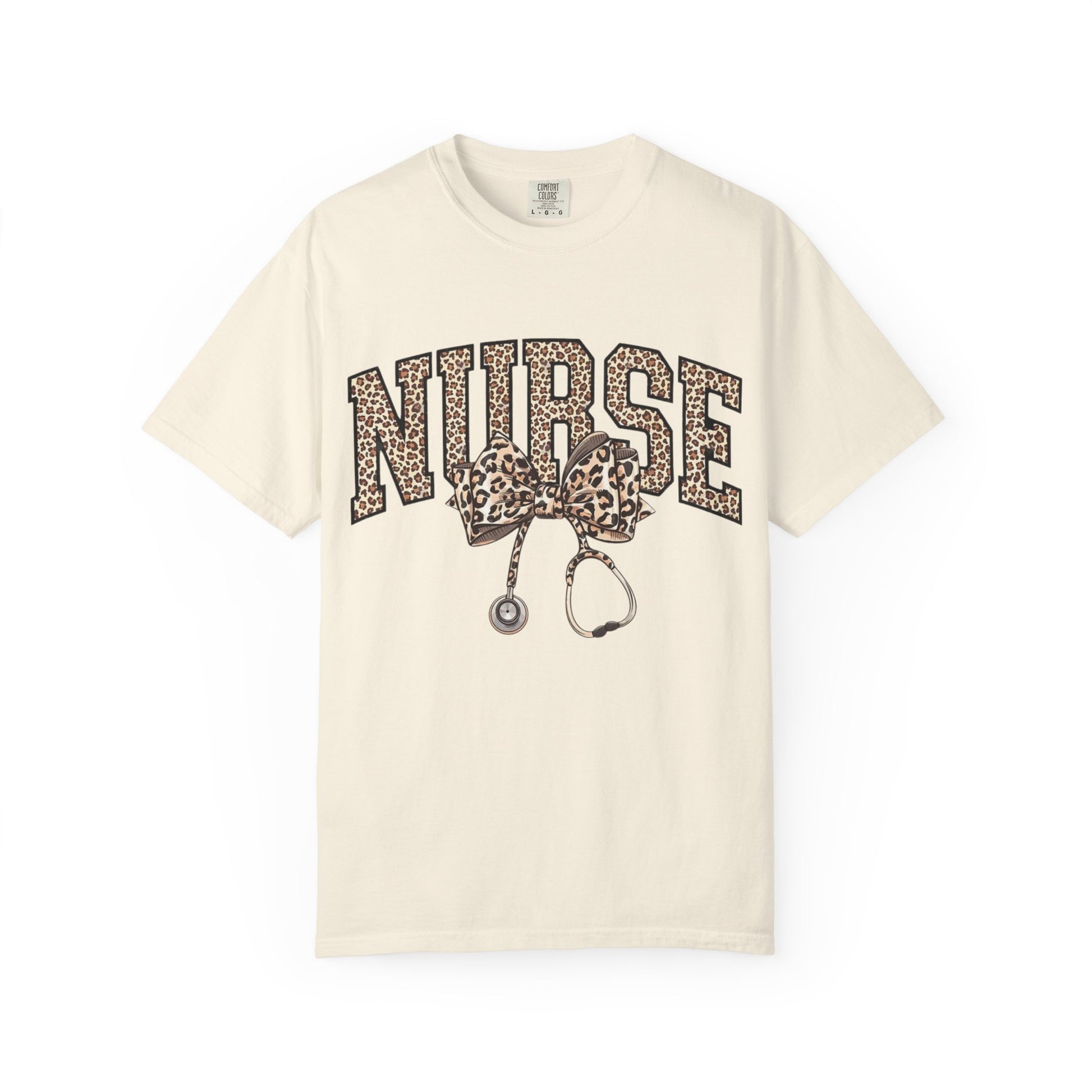Lightweight yet substantial, this garment-dyed cotton tee brings warmth and personality to long shifts and off-duty moments. A bold leopard print "NURSE" headline pairs with a matching bow and a delicate stethoscope illustration — a playful, confident nod to clinical life. The heavy, pre-shrunk ring-spun cotton softens with wear and the dyeing process, so the shirt becomes more lived-in and comfortable over time. Wear it between rounds, on coffee breaks, or on casual days when you want to celebrate nursing with a little stylish flair.