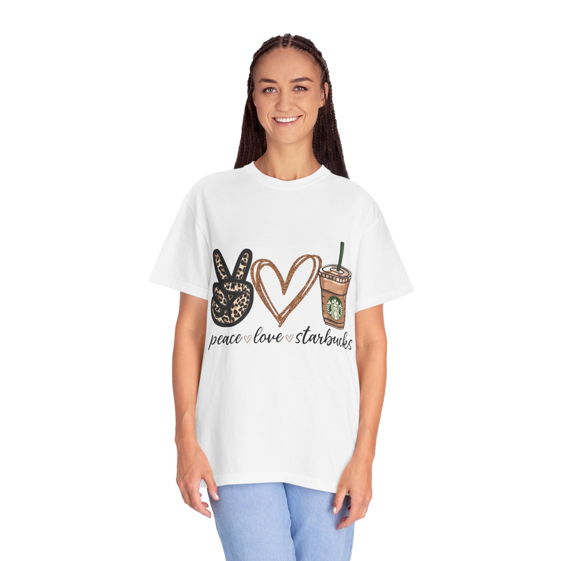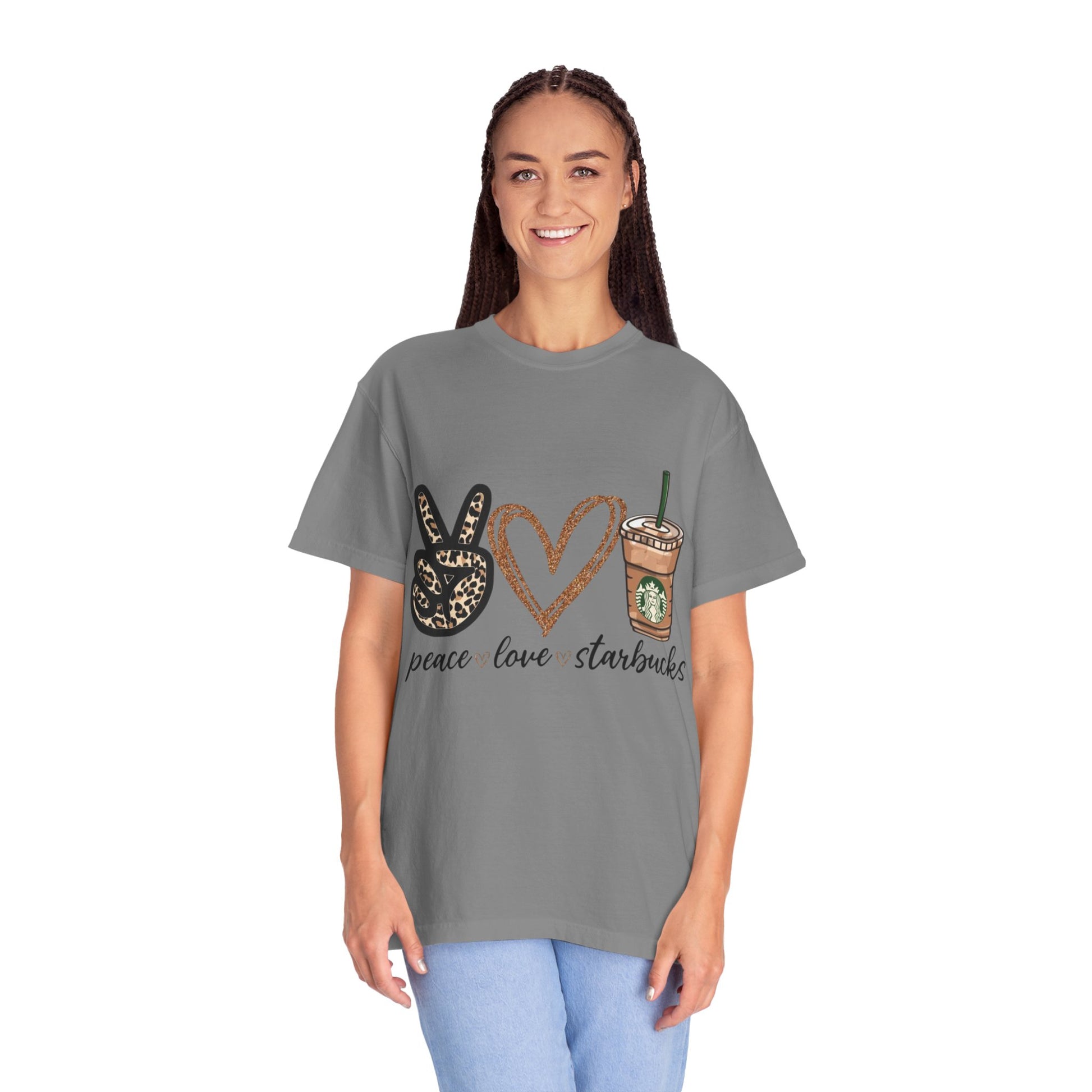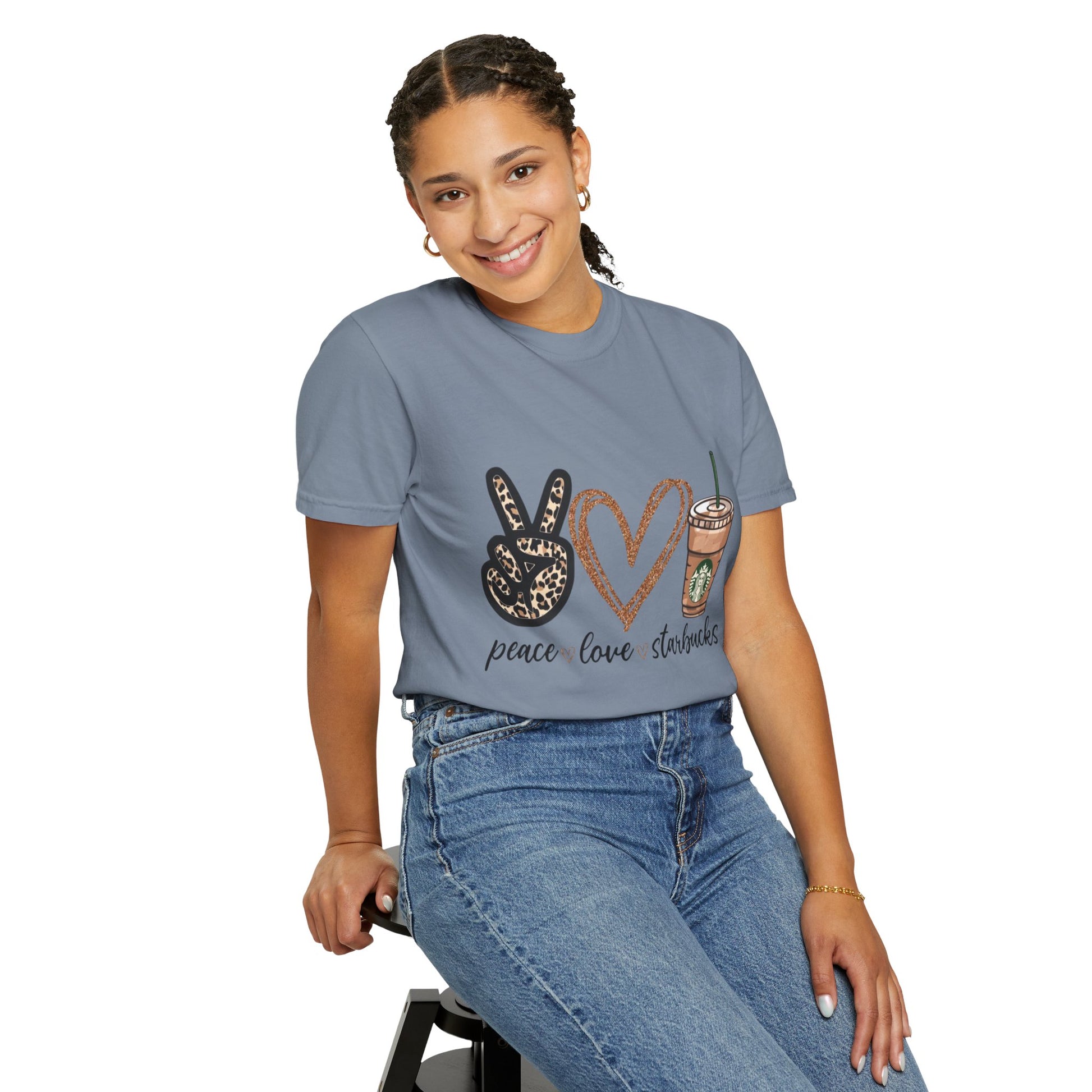 Lightweight yet sturdy, this garment-dyed tee brings quiet charm to everyday wardrobe moments. A relaxed silhouette and heavyweight 100% ring-spun cotton feel soft against the skin, softened further by the post-construction dye for a lived-in look. The front print—peace sign, hand-drawn heart, and an iced coffee cup—reads as a cheerful, casual declaration: peace • love • starbucks. It sits right where a weekend latte ritual meets slow mornings and friendly errands. Built to age gracefully, the tubular knit and double-needle seams keep the shape steady through repeated wear. Offered in a wide range of colors and sizes, it layers easily under jackets or stands alone with jeans for coffee runs, meet-ups, or lazy afternoons at the park.