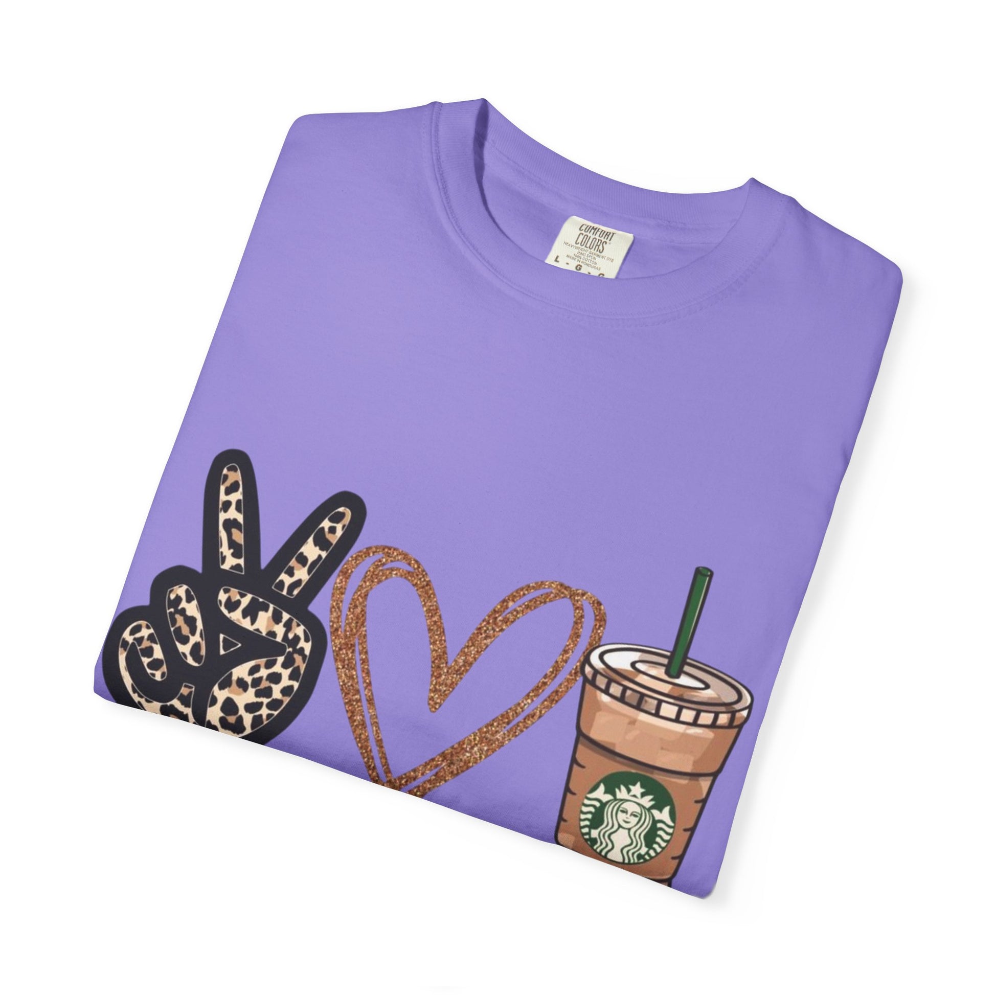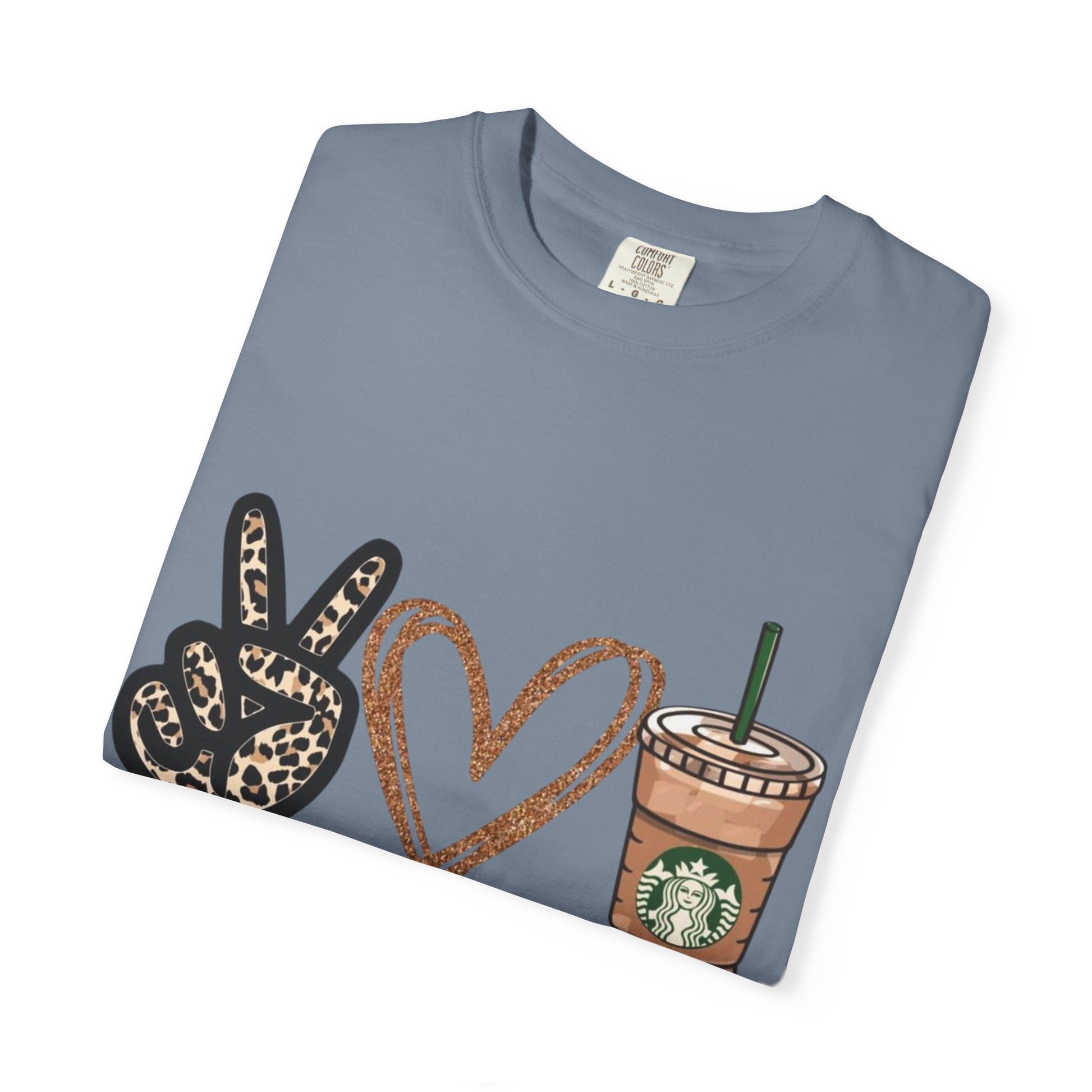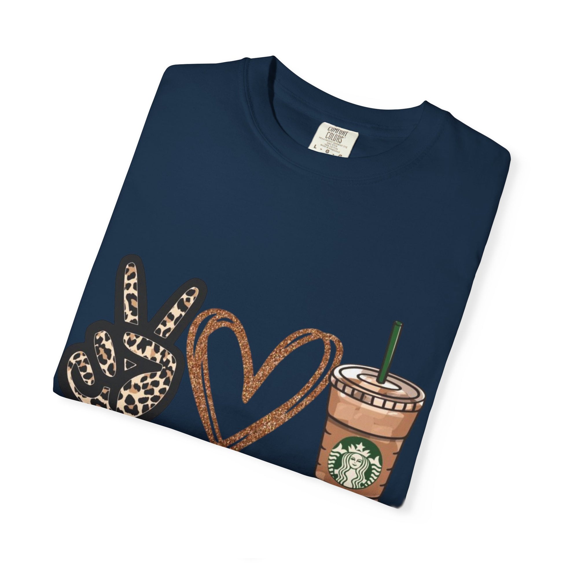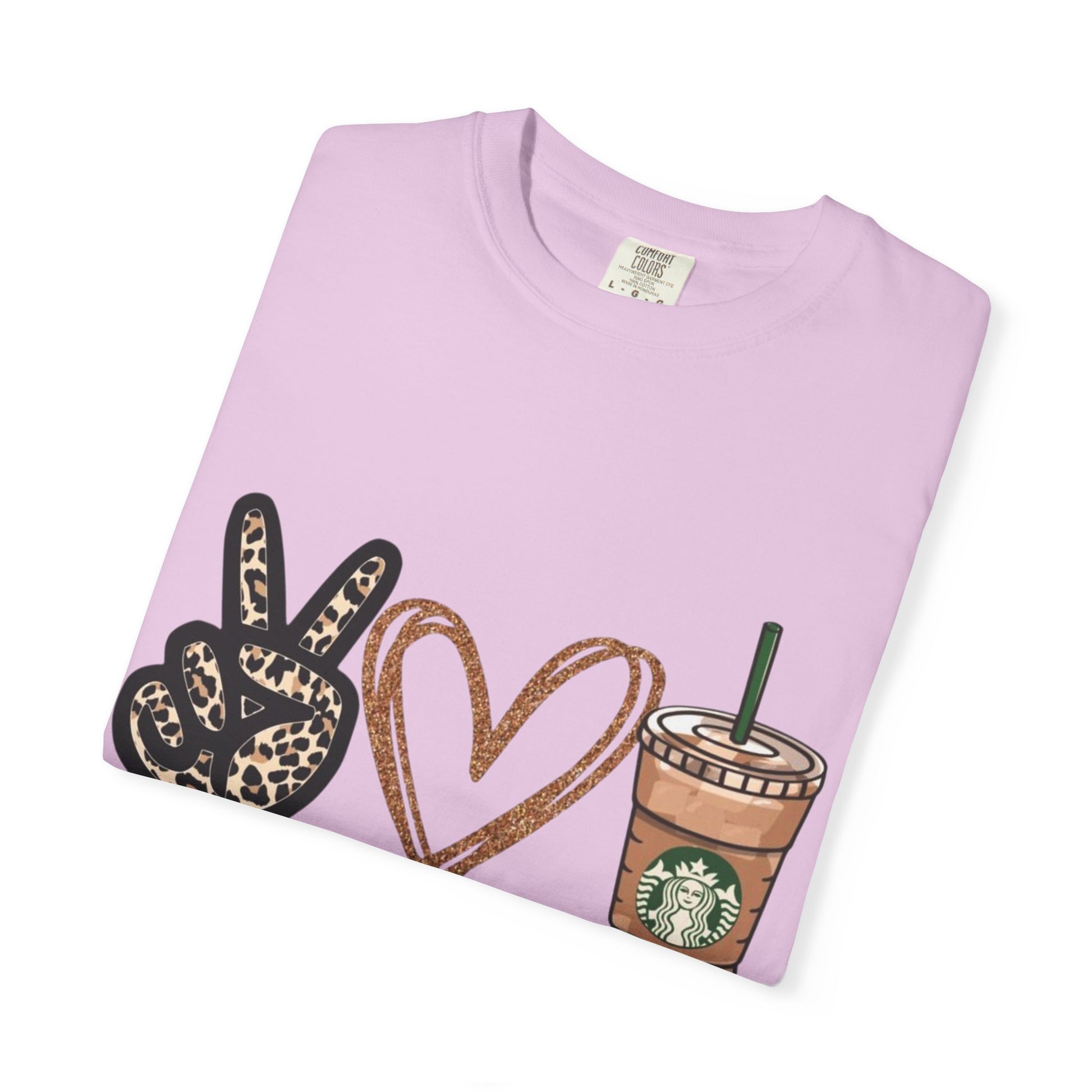 Lightweight yet sturdy, this garment-dyed tee brings quiet charm to everyday wardrobe moments. A relaxed silhouette and heavyweight 100% ring-spun cotton feel soft against the skin, softened further by the post-construction dye for a lived-in look. The front print—peace sign, hand-drawn heart, and an iced coffee cup—reads as a cheerful, casual declaration: peace • love • starbucks. It sits right where a weekend latte ritual meets slow mornings and friendly errands. Built to age gracefully, the tubular knit and double-needle seams keep the shape steady through repeated wear. Offered in a wide range of colors and sizes, it layers easily under jackets or stands alone with jeans for coffee runs, meet-ups, or lazy afternoons at the park.